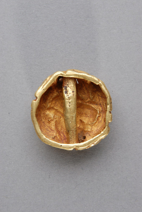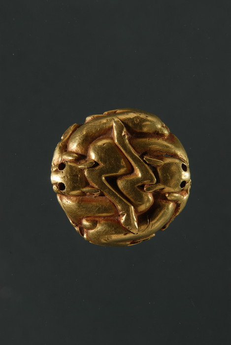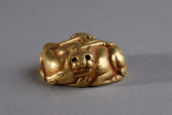 整体呈圆形。主体纹为二虎二鹿,构成两组相同的虎鹿盘曲噬斗图案。两虎分别噬住两鹿颈部。两鹿双眼圆睁,后肢搭于虎背之上作挣扎状。背面有一钮。