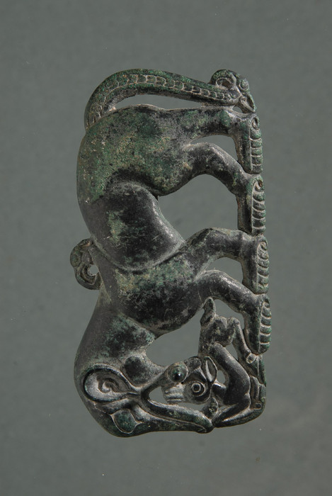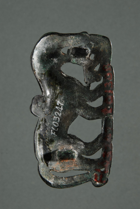 整体为透雕虎噬羊图案。虎长颈,细腰拱起,尾部饰连锁纹下垂,尾端卷曲,尾部及虎背装饰鸟头纹,椭圆形大耳,桃形眼,张口衔住一屈体小羊的头部。小羊眼圆睁,长耳,短尾,四肢蜷曲作挣扎状。形象生动,艺术造型独特。