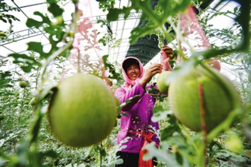 金凤区润丰村村民打理温棚里种植的特色产品吊瓜。