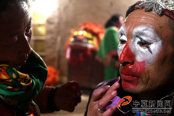 当日18时许,天刚擦黑,参加当天社火转村的社火演员们就已经聚在村里的戏台子上开始画脸换衣。天气很冷,露天的戏台中间只有一个煤炉子用来取暖。画脸用的颜料因为冷被冻住,画脸的人只好将颜料拿到炉子的火上面烤一烤,等颜料化开了再接着画。会画脸的人不多,为了得到满意的效果,大家拿出手机找到合适的画面对照着画。
