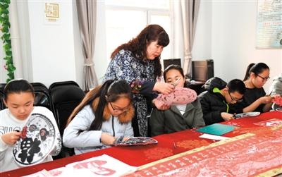 2月16日,宁夏非物质文化遗产剪纸项目传承人王宪苓在石嘴山市惠农区南街街道办事处乐新社区对青少年剪纸进行培训。近年来,王宪苓长年服务于社区文化活动,让居民们近距离感受“非遗”的魅力。记者 左鸣远 摄
