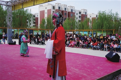 4月25日上午,银川市兴庆区福宁街街道办事处秦韵乐艺术团表演秦腔火焰驹选段《赞花》。当日,为丰富广大人民群众的精神文化生活,培育和传播正能量,加大送文化种文化力度,宁夏文化馆启动了“文化走亲·欢乐有约”文化志愿服务进社区活动。记者 陈秀梅 摄