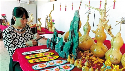 杨梓仁的妻子在制作串珠和刺绣作品。6月11日,彭阳县城阳乡杨坪村村民杨梓仁在家中制作根雕艺术品。他是当地有名的“农民艺术家”,根雕作品栩栩如生,深受游客欢迎。同时,他的妻子制作串珠和刺绣作品,夫妻俩利用农闲时间制售旅游产品,一年下来有数千元的收入。记者 丁建峰 摄