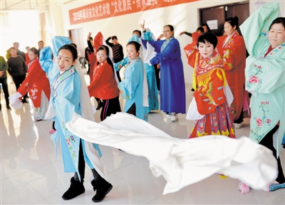 1月15日,银川市文化艺术馆的舞蹈排练厅传出阵阵歌声,“打开,转手腕,回头,走……”宁夏文化馆文艺骨干马晓燕神采奕奕,带领兴庆区凤凰北街街道办事处崇安社区银梦艺术团的队员练习即将在春节前演出的舞蹈《吆骡子》。作为宁夏文化馆文艺骨干之一,接手银梦艺术团两年来,马晓燕起初教授他们简单的、普适性的舞蹈,后来根据该团特点,将原生态的民歌重新编曲,量身创排了专属舞蹈。