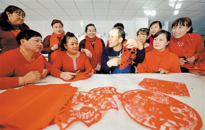 银川市金凤区满城北街街道办事处平伏桥村综合文化服务中心,银川市级非物质文化遗产传承人张旺红(中)为爱好者传授剪纸技艺。金凤区文体旅游局积极开展文化指导员下基层活动,聘请刺绣、麻编等非物质文化遗产传承人为指导员,让生态移民、失地农民感受非遗文化。