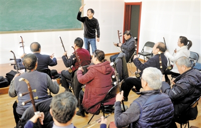 国家一级作曲、一级板胡演奏家安育民,就弦乐基本功、包腔的技巧等对50余名爱好者进行培训。