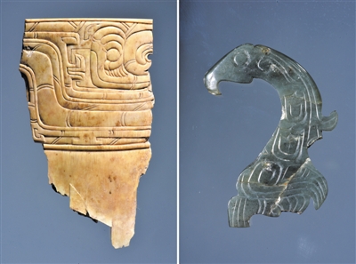 宁夏彭阳姚河塬西周遗址出土的兽面纹象牙杯残片(左)和玉凤(右)。新华社发