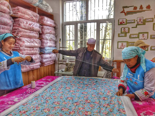 泾源县泾河源镇泾光村的扶贫车间内,村民正在缝制“致富棉被”
