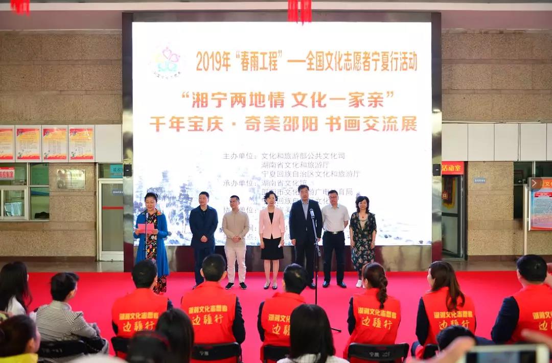 文化春雨润宁夏,志愿服务惠民生。作为宁夏品牌群众文化活动之一的2019年“春雨工程”——湖南省文化旅游志愿者宁夏行活动,于4月26日—4月28日在银川成功举办,自治区党委宣传部副部长毛录、湖南省文化和旅游厅副厅长尚斌、宁夏文化和旅游厅副厅长赵明霞、龚铁军等领导出席启动仪式,并参加了其中部分活动。