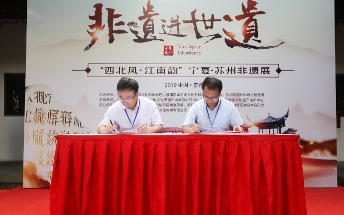 活动现场,参会领导和嘉宾共同为此次宁夏苏州非遗展活动开幕,联合国教科文组织亚太地区世界遗产培训与研究中心(苏州)分中心与宁夏艺术职业学院签署了合作意向书,双方将搭建学术平台,互学互助,共同探索,积极携手开展世界遗产青少年教育活动。