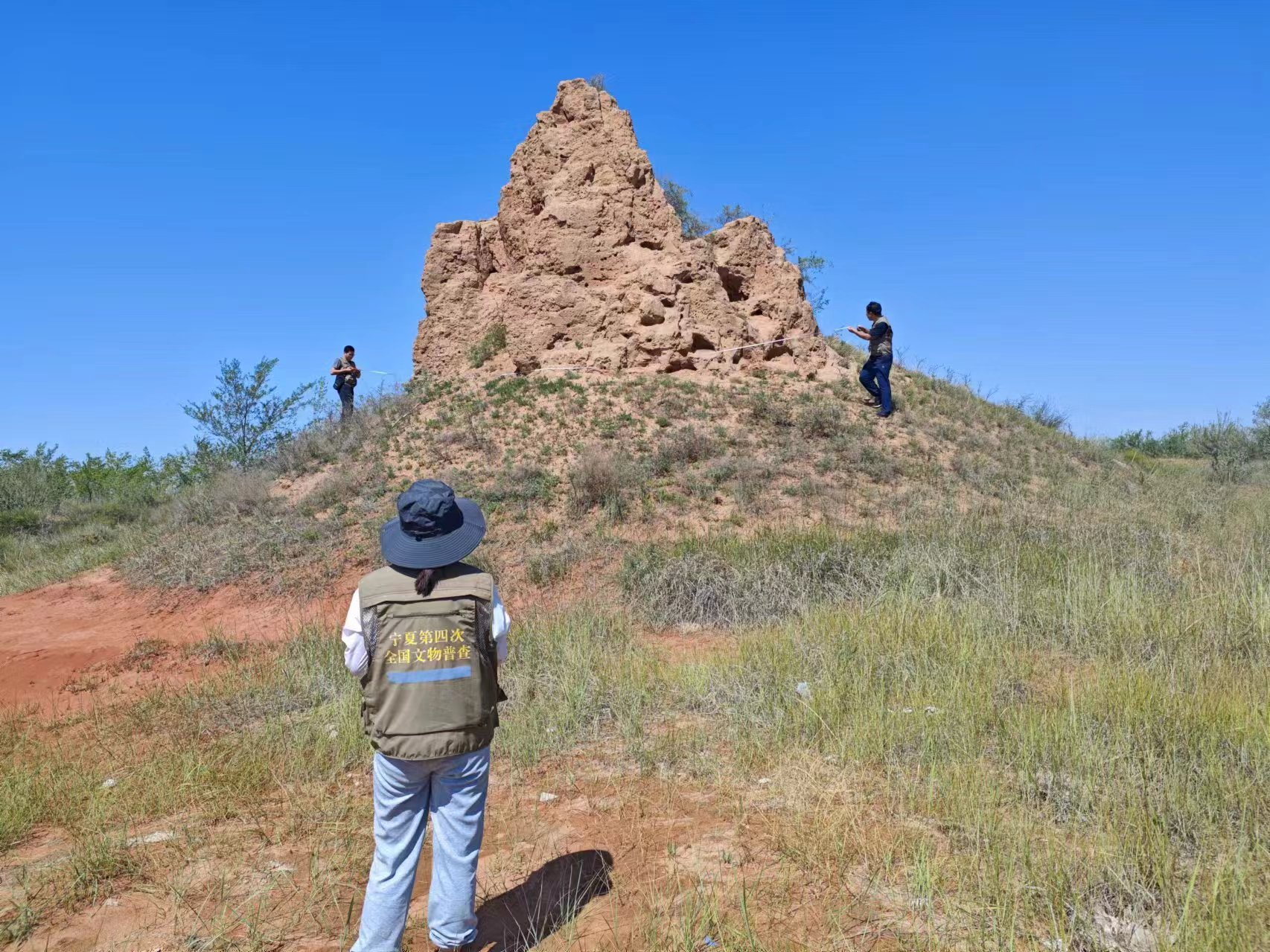 野外调查既是技术考验,更是体能挑战。盐池南部黄土丘陵沟壑密布,北部鄂尔多斯缓坡丘陵风大干燥,普查队员不仅要破解“寻迹难、定位难”的难题,更需直面严酷自然环境。在惠安堡镇与麻黄山乡交界的固原内边长城段,队员们徒步穿行荆棘之间;盛夏地表温度逾四十摄氏度,寒冬大雪封山,队员们肩扛设备踏雪前行。阳岗汉墓调查中,年逾古稀的村支书主动带路,带领队员手脚并用攀爬泥泞山路,那份对乡土文化的深情成为普查路上最温暖的力量。