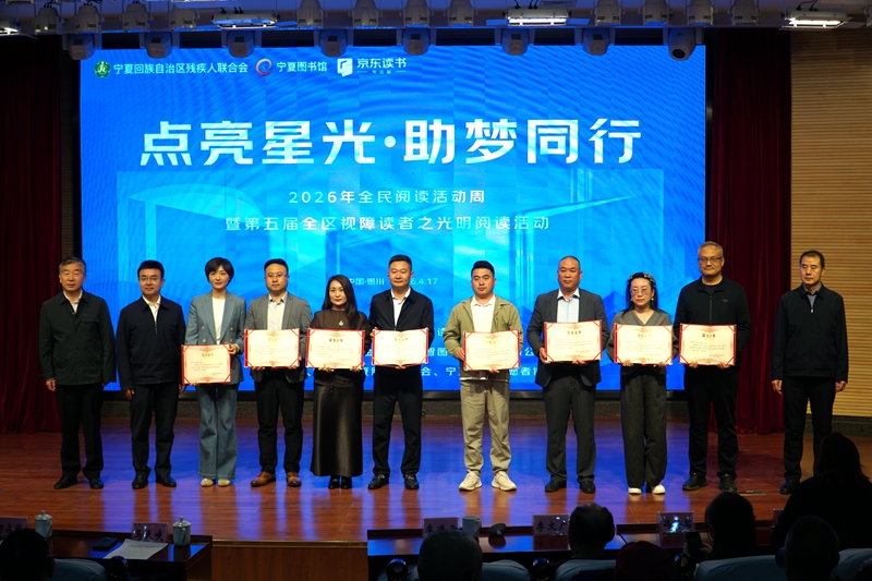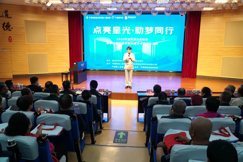 4月17日上午,由自治区残联、自治区文化和旅游厅、宁夏图书馆、京东读书联合主办,自治区残疾人福利基金会、宁夏盲人协会、宁夏肢残人协会、宁夏助残志愿者协会共同承办的2026年全民阅读活动周暨第五届宁夏视障读者“光明阅读”活动在宁夏图书馆一楼报告厅举行。本次活动以“点亮星光·助梦同行”为主题,来自全区各地的残疾人代表、爱心企业代表、志愿者等160余人参加活动。