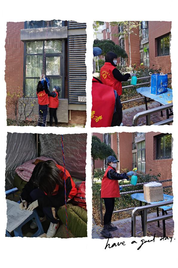 王忆楠在她的抗疫日记中分享了她们的工作内容:帮助19号楼1单元的住户解决生活中各方面的困难,取快递(方式多种多样)、送药品、取生活用品并对各种物品及垃圾进行消毒。