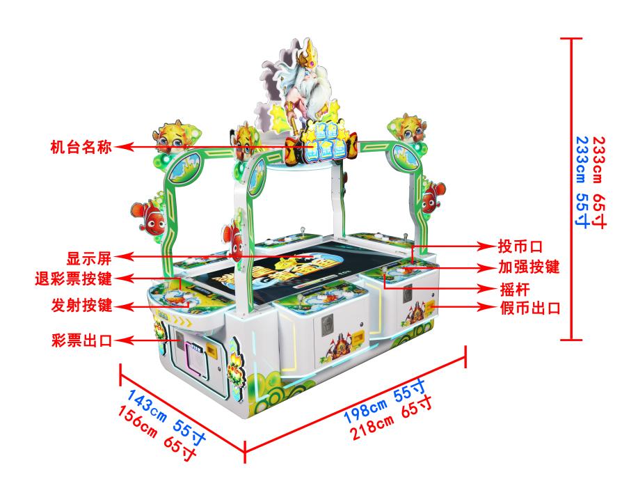 游戏内容简介 | 《鲨皇黄金鱼(平面6人)》是为大众娱乐而设计的一款支持6人玩的游戏游艺彩票机,本机支持合法合规的管理系统,也可通过打开微信或支付宝扫一扫管理系统卡头二维码/屏幕二维码/实体二维码扫码支付投币或投入实体游戏代币获得对应的能量积分子弹数后玩家即可手动启动游戏。本机适用于网咖、竞技馆、动漫城、商超、台球俱乐部等符合经营许可的使用场所。本游戏是以多场景+海洋生物+异兽+道具为题材(比如:金色大龙虾,蝴蝶鱼,八爪鱼,变色灯笼鱼,红鲤鱼,斑斓鱼,变色鲸鱼,变色旗鱼,变,魔鬼鱼,小丑鱼,飞鱼,鲷鱼,鲽鱼,乌贼,河鲀,旗鱼,海龟,灯笼鱼,蝠魟鱼,锯齿鲨,鲨鱼,深水炸弹,幸运转轮,猎鱼任务,超级黄金鱼,彩虹鱼,彩虹鲨)等等,由多种不同风格的场景,众多各具特色的海洋生物+异兽+道具身上蕴藏着无尽的秘密,等待着勇敢的玩家深入探索,体验一场视觉盛宴。在射击过程中击杀金色大龙虾、超级黄金鱼等可以获得超级大奖,让玩家获得丰厚的彩票/能量积分奖励。本机同时支持八人台。同时在游戏中,玩家在射击任意海洋生物+异兽+道具时,会消耗能量积分子弹数,击杀任何的海洋生物+异兽+道具都会得到该海洋生物+异兽+道具相对应的彩票/能量积分奖励,当玩家能量积分子弹数为零时则游戏结束。同时玩家可用获得的能量积分手动选择退实物彩票/电子彩票/积分,可到店面吧台用彩票/电子彩票/积分兑换精美礼品,也可以链接到电子商城上选择心仪的礼品使用彩票/电子彩票/能量积分兑换,填写正确的收货地址,商城将精美礼品通过快递送达。同时为了“顺应“互联网+”发展趋势,鼓励娱乐场所与互联网结合发展,实现场内场外、线上线下互动,增强娱乐场所体验式服务”的要求,本设备可以通过物联网技术把实体游戏游艺设备的游戏内容推送到移动端供客人游玩,仅限于从实体设备所在的公众号、小程序、APP及网络推广平台入口进入的玩家游玩。 | ||