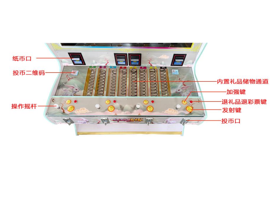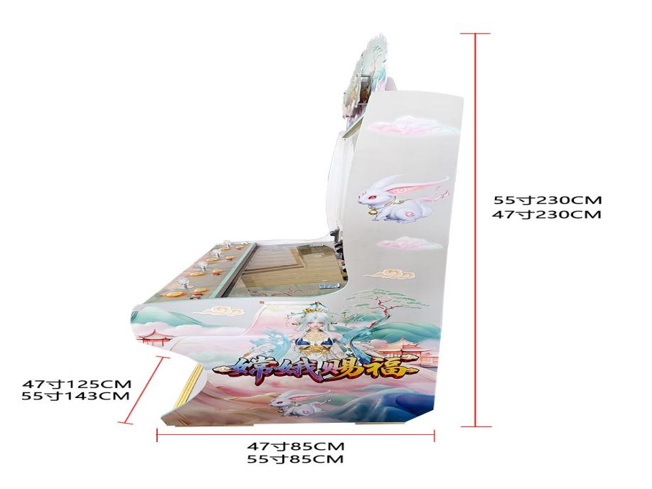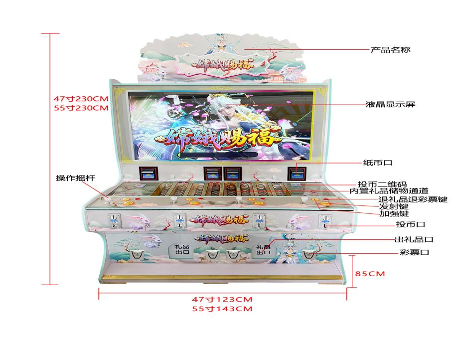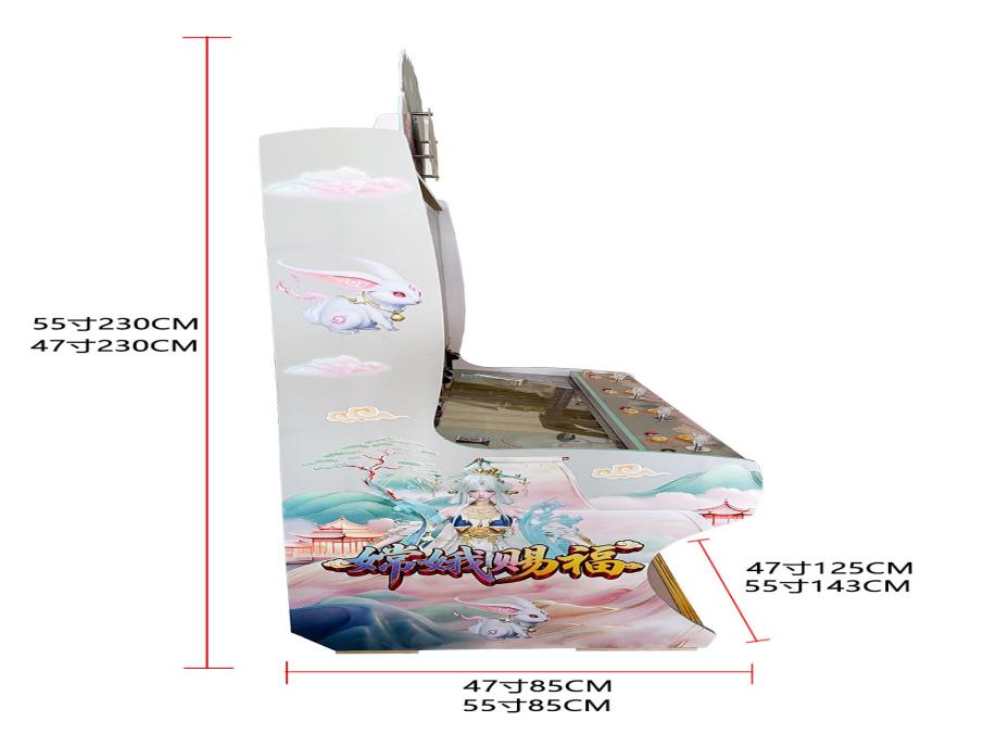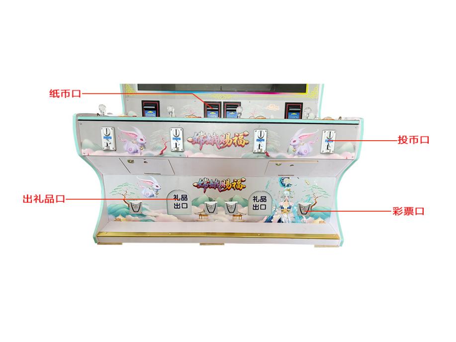 游戏内容简介 | 《嫦娥赐福(型号2)》是为大众娱乐而设计的一款游戏游艺彩票/礼品机,本机支持合法合规的管理系统,也可通过打开微信或支付宝扫一扫管理系统卡头二维码/屏幕二维码/实体二维码扫码支付投币或投入实体游戏代币获得对应的能量积分子弹数后玩家即可手动启动游戏。本机适用于网咖、竞技馆、动漫城、商超、台球俱乐部等符合经营许可的使用场所。本游戏是以多场景+海洋生物+异兽+道具为题材(比如:小眼鱼,大眼鱼,粉色胖头鱼,红色病毒鱼,斑斓鱼,绿色鱼,粉色贝壳鱼,蝴蝶鱼,灯笼鱼,乌龟,蓝色魔鬼鱼,炸弹银鲨,炸弹金鲨,金色紧箍咒,粉色蟠桃,金色蟠桃,猴子宝宝,嫦娥赐福定屏炸弹,礼品美人鱼,一箭双雕礼品美人鱼,连中三元礼品美人鱼,随机礼品美人鱼,大满贯礼品美人鱼,螃蟹电磁炮,螃蟹连环炸弹,螃蟹钻头炮,螃蟹火焰弹,蓝色圆圈闪电连锁,金色摇钱树拍拍乐30秒,金龙,大红包,变异财神,飞天白虎,变异莲花,七彩凤凰同类炸弹,变异玉兔局部炸弹,变异嫦娥超级炸弹)等等,由多种不同风格的场景,众多各具特色的海洋生物+异兽+道具身上蕴藏着无尽的秘密,等待着勇敢的玩家深入探索,体验一场视觉盛宴。同时本机支持立式三人台四十七寸以及五十五寸。在射击过程中击杀变异玉兔局部炸弹,变异嫦娥超级炸弹等可以获得超级大奖,让玩家获得丰厚的彩票/能量积分奖励。同时在游戏中,玩家在射击任意海洋生物+异兽+道具时,会消耗能量积分子弹数,击杀任何的海洋生物+异兽+道具都会得到该海洋生物+异兽+道具相对应的彩票/能量积分奖励,当玩家能量积分子弹数为零时则游戏结束。玩家可用获得的能量积分手动选择退实物彩票/电子彩票/积分/礼品/礼品积分卡,到店面吧台用实物彩票/电子彩票/积分/礼品积分卡兑换精美礼品。玩家也可以选择退电子彩票/能量积分直接返还到玩家手机上,也可以用手机扫卡头/屏幕二维码领取电子彩票/能量积分,都可以链接到电子商城上选择心仪的礼品使用电子彩票/能量积分/礼品积分卡兑换。同时为了“顺应“互联网+”发展趋势,鼓励娱乐场所与互联网结合发展,实现场内场外、线上线下互动,增强娱乐场所体验式服务”的要求,本设备可以通过物联网技术把实体游戏游艺设备的游戏内容推送到移动端供客人游玩,仅限于从实体设备所在的公众号、小程序、APP及网络推广平台入口进入的玩家游玩。 | ||