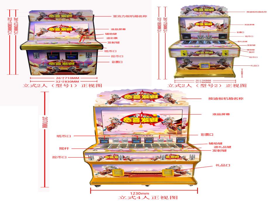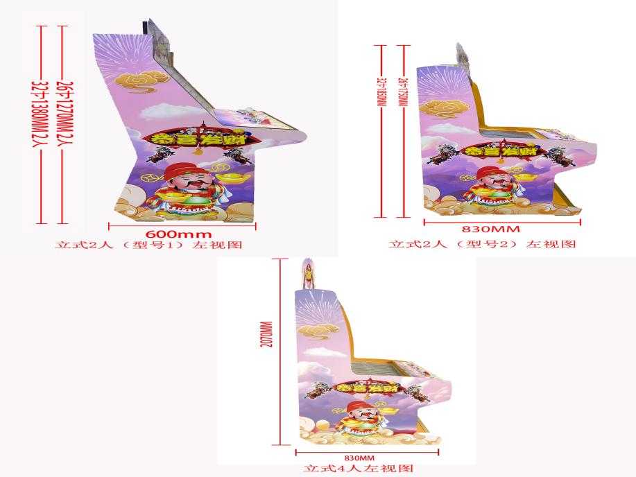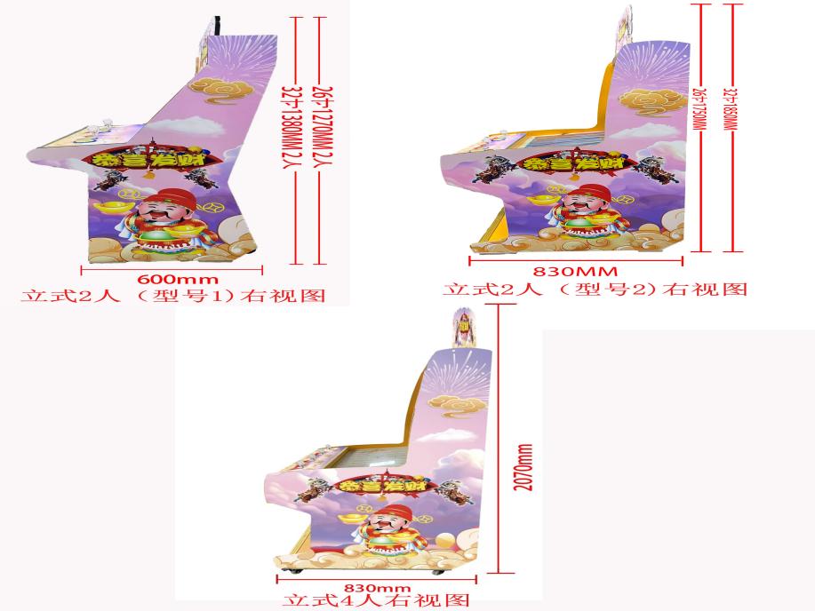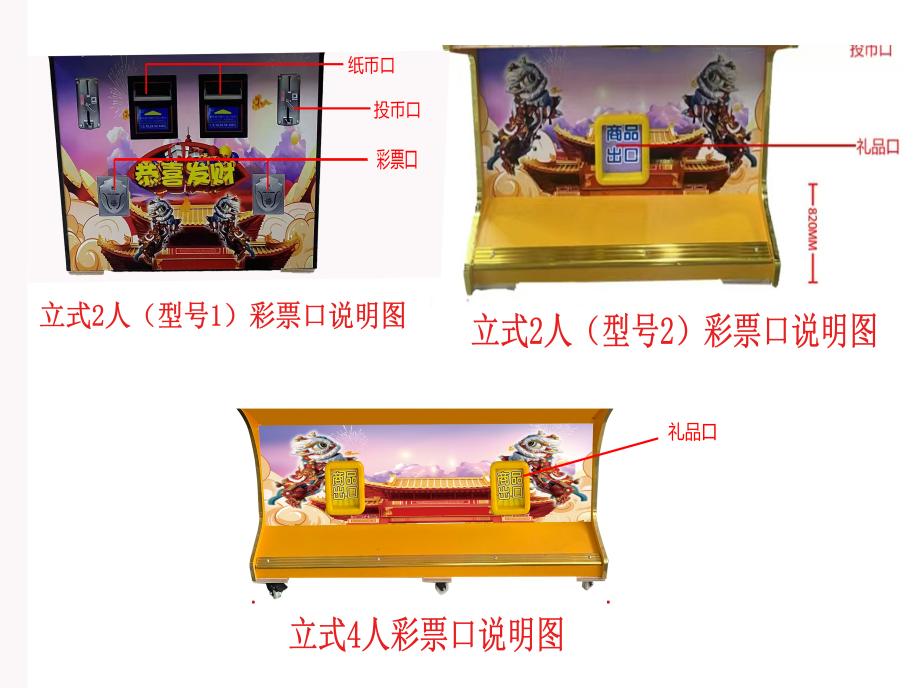 游戏内容简介 | 《恭喜发财》是为大众娱乐而设计的一款支持2人、3人、4人同时游玩的游戏游艺礼品/彩票机,本机支持合法合规的管理系统,也可通过打开微信或支付宝扫一扫管理系统卡头二维码/屏幕二维码/实体二维码扫码支付投币或投入实体游戏代币获得对应的能量积分子弹数后玩家即可手动启动游戏。本机适用于网咖、竞技馆、动漫城、商超、台球俱乐部等符合经营许可的使用场所。本游戏是以多场景+海洋生物+异兽+道具为题材(比如:小眼鱼,大眼鱼,斑斓鱼,大头鱼,灯笼鱼,乌龟,蝴蝶鱼,马尾鱼,箭头鱼,魔鬼鱼,螃蟹,孔雀,凤凰,金鲨,狮子,火龙,金牛,财神)等等,由多种不同风格的场景,众多各具特色的海洋生物+异兽+道具身上蕴藏着无尽的秘密,等待着勇敢的玩家深入探索,体验一场视觉盛宴。在射击过程中击杀金牛,狮子,孔雀等可以获得超级大奖,让玩家获得丰厚的彩票/能量积分奖励。同时在游戏中,玩家在射击任意海洋生物+异兽+道具时,会消耗能量积分子弹数,击杀任何的海洋生物+异兽+道具都会得到该海洋生物+异兽+道具相对应的彩票/能量积分奖励,当玩家能量积分子弹数为零时则游戏结束。同时玩家可用获得的能量积分手动选择退实物彩票/电子彩票/积分,可到店面吧台用彩票/电子彩票/积分兑换精美礼品,可以用手机扫卡头/屏幕二维码领取电子彩票/能量积分,也可以链接到电子商城上选择心仪的礼品使用彩票/电子彩票/能量积分兑换,填写正确的收货地址,商城将精美礼品通过快递送达。同时为了“顺应“互联网+”发展趋势,鼓励娱乐场所与互联网结合发展,实现场内场外、线上线下互动,增强娱乐场所体验式服务”的要求,本设备可以通过物联网技术把实体游戏游艺设备的游戏内容推送到移动端供客人游玩,仅限于从实体设备所在的公众号、小程序、APP及网络推广平台入口进入的玩家游玩。 | ||