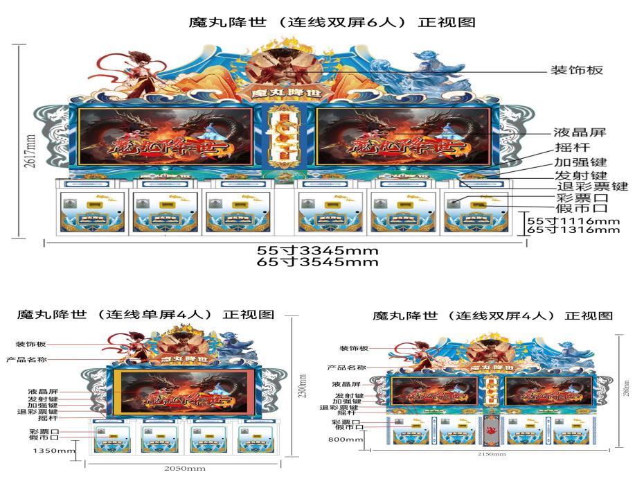 游戏内容简介 | 游戏简介:《魔丸降世(连线)》是为大众娱乐而设计的一款游戏游艺彩票机,本机支持合法合规的管理系统,也可通过打开微信或支付宝扫一扫管理系统卡头二维码/屏幕二维码/实体二维码扫码支付投币或投入实体游戏代币获得对应的能量积分子弹数后玩家即可手动启动游戏。本机适用于网咖、竞技馆、动漫城、商超、台球俱乐部等符合经营许可的使用场所。本游戏是以多场景+海洋生物+异兽+道具为题材(比如鱼类题材一:卡通刺尾鱼、卡通刺豚鱼、卡通公子小丑鱼、卡通热带鱼、卡通海马、卡通金鱼、卡通龙虾、卡通观赏鱼、卡通多彩鱼、卡通娃娃鱼、卡通青蛙鱼、卡通长须鱼、卡通巨齿鱼、卡通灯笼鱼、卡通电鳗、卡通乌龟、卡通蓝鲨、卡通蓝鲸、卡通灰鲸、卡通金龙鱼、卡通金鲨、卡通胖头鲨、金色美人鱼、飞镖、卡通龙王、变异蓝龙鱼、变异外星球集满五个送彩金、深海紫鲸、螃蟹电磁炮、螃蟹钻头炮、螃蟹连环炸弹、元宝招财猫开心30秒拍拍乐、九五至尊送斧头、九五至尊送宝塔、九五至尊送砸金蛋、九五至尊送鲨鱼、七彩凤凰觉醒、深海变异龙龟、超级神龙、变异敖丙炸弹、变异财神送幸运大奖、旋风鱼王、闪电连锁、红色渔王、各类型组合鱼、变异哪吒全屏炸弹等等。鱼类题材二:雀鲷鱼、热带鱼、贝壳鱼、狮子鱼、胖头鱼、病毒鱼、蓝斑鱼、灯笼鱼、乌龟、响尾鱼、爆眼鱼、神仙鱼、小黑龙、小蓝龙、小金龙、金色圆盘任务、红色小财神、黄色小财神、闹龙宫定屏炸弹、礼品美人鱼、红凤凰随机礼品鱼、金凤凰全中礼品鱼、螃蟹电磁炮、螃蟹钻头炮、螃蟹连环炸弹、螃蟹火焰弹、蓝色闪电连锁、金色摇钱树闪电连锁、超级神龙、变异大财神、变异红色孙悟空、变异太上老君、变异敖丙、魔丸降世同类炸弹、紧箍圈局部炸弹、变异哪吒超级炸弹等等)。由多种不同风格的场景,众多各具特色的海洋生物/异兽/道具身上蕴藏着无尽的秘密,等待着勇敢的玩家深入探索,体验一场视觉盛宴。在射击过程中击杀变异哪吒超级炸弹可以获得超级大奖,让玩家获得丰厚的彩票/能量积分奖励。同时在游戏中,玩家在射击任意海洋生物/异兽/道具时,会消耗能量积分子弹数,击杀任何的海洋生物/异兽/道具都会得到该海洋生物/异兽/道具相对应的彩票/能量积分奖励,当玩家能量积分子弹数为零时则游戏结束。玩家可用获得的能量积分手动选择退实物彩票/电子彩票/积分,到店面吧台用实物彩票/电子彩票/积分兑换精美礼品。玩家也可以选择退电子彩票/能量积分直接返还到玩家手机上,也可以用手机扫卡头/屏幕二维码领取电子彩票/能量积分,都可以链接到电子商城上选择心仪的礼品使用电子彩票/能量积分兑换。同时为了“顺应“互联网+”发展趋势,鼓励娱乐场所与互联网结合发展,实现场内场外、线上线下互动,增强娱乐场所体验式服务”的要求,本设备可以通过物联网技术把实体游戏游艺设备的游戏内容推送到移动端供客人游玩,仅限于从实体设备所在的公众号、小程序、APP及网络推广平台入口进入的玩家游玩。 | ||