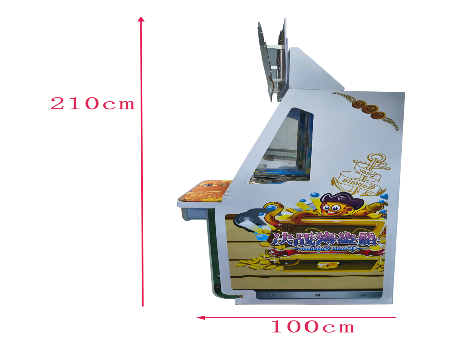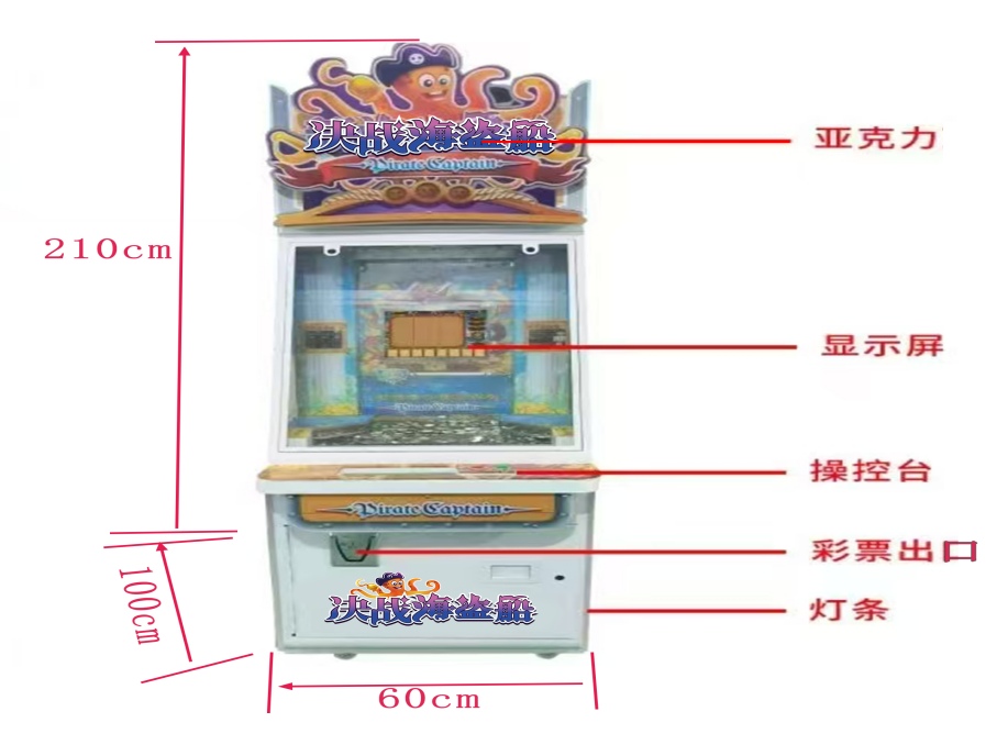 游戏内容简介 | 《决战海盗船》是为大众娱乐而设计的一款以推推乐为主题的推币类游戏游艺娱乐设备,本机支持合法合规的管理系统,也可通过打开微信或支付宝扫一扫管理系统卡头二维码/屏幕二维码/实体二维码扫码支付投币或投入实体游戏代币后玩家即可开始游戏。本机适用于网咖、竞技馆、动漫城、商超、台球俱乐部等符合经营许可的使用场所。这款游艺设备结合融入了很多海盗经典道具及人物角色;如经典的,海盗船,鹦鹉,船长佩刀,望远镜,船锚,船舵,酒,宝箱,小游戏:连线奖,斜线奖,开心68秒,挑战全盘奖励翻倍,。这些道具不仅仅是物品,更是决战海盗船展现魅力,创造奇迹的重要工具,他们共同构成了一个充满魅力和神秘的海盗船世界。让游戏玩家仿佛置身于这个神秘的海盗船世界之中,玩家通过投入游戏代币的时间和雨刷器左右摆动的频率,来控制游戏代币从机器最顶端掉落到堆盘的时间节点,并判断游戏代币掉落到左右移动的幸运通道口的机会。当游戏代币落入幸运通道,将获得更多从机器最顶端的落币奖励到堆盘;如果游戏代币直接掉落到堆盘时,则堆盘推动游戏代币前进和叠加,当游戏代币滑落堆盘时,玩家可获得彩票奖励。同时玩家可用获得的彩票奖励手动选择退实物彩票/电子彩票/积分,可到店面吧台用彩票/电子彩票/积分兑换精美礼品,也可以链接到电子商城上选择心仪的礼品使用彩票/电子彩票/能量积分兑换,填写正确的收货地址,商城将精美礼品通过快递送达。同时为了响应文市发【2016】26号文件内容:“顺应“互联网+”发展趋势,鼓励娱乐场所与互联网结合发展,实现场内场外、线上线下互动,增强娱乐场所体验式服务”的要求,本设备可以通过物联网技术把实体游戏游艺设备的游戏内容推送到移动端供客人游玩,仅限于从实体设备所在的公众号、小程序、APP及网络推广平台入口进入的玩家游玩。 | ||