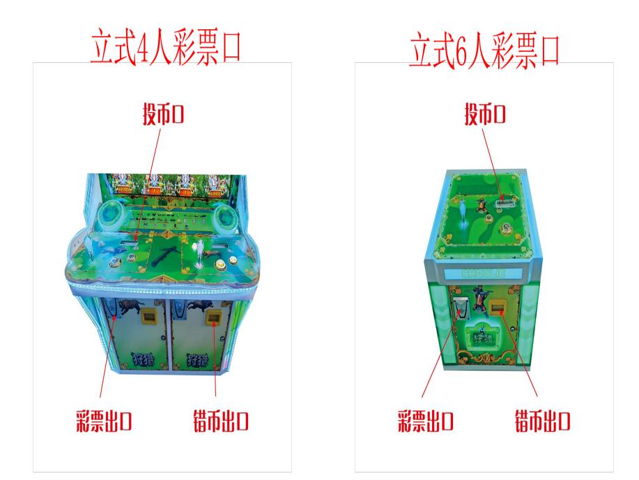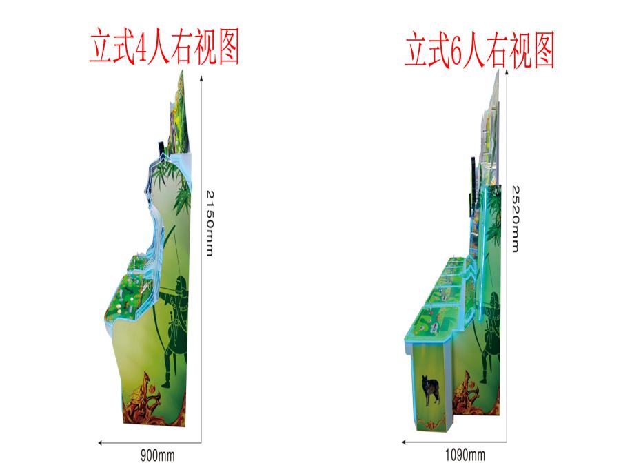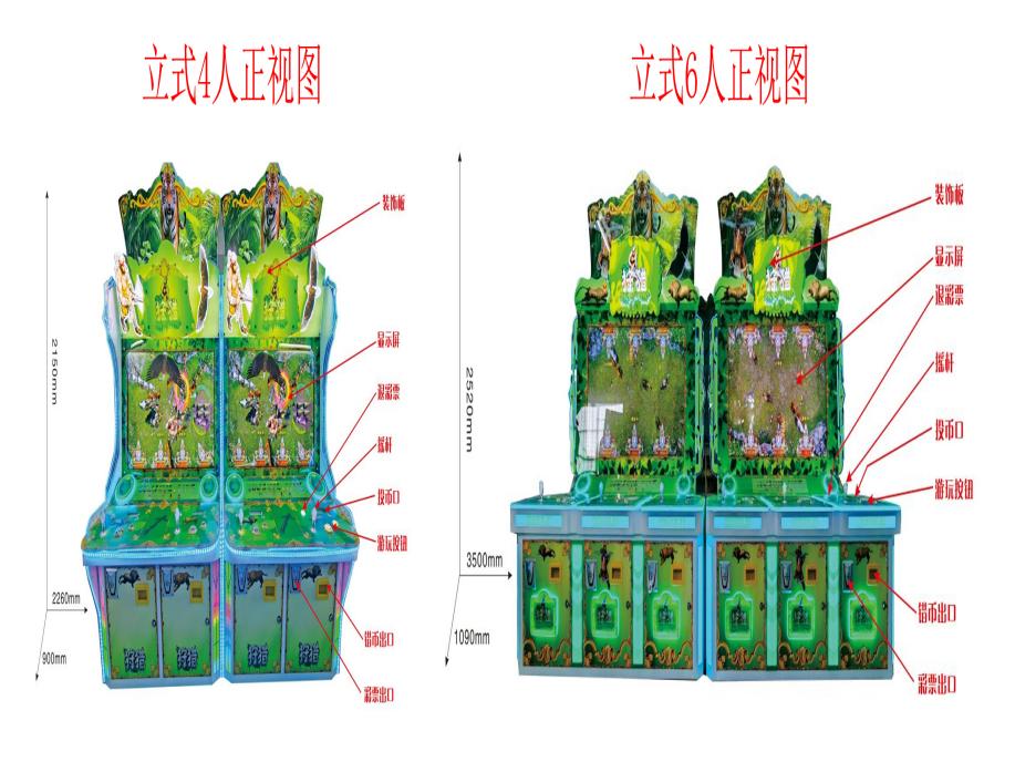 游戏内容简介 | 《狩猎(立式4/6人)》是为大众娱乐而设计的一款单人、多人游玩的射击类游戏游艺彩票机。本机支持合法合规的管理系统,也可通过打开微信或支付宝扫一扫管理系统卡头二维码/屏幕二维码/实体二维码扫码支付投币或投入实体游戏代币等方式获得对应的竞猜积分后玩家即可开始游戏/或等待机器自动倒计时。本机适用于网咖、竞技馆、动漫城、商超、台球俱乐部等符合经营许可的使用场所。在大自然中动物动物为躲避人类伤害,逐渐进化出各种自保的功能,如翅膀,利爪,伪装,毒液等;可是不管动物如何进化都逃不过人类的捕猎,因为人类在不断进化的过程,制作了狩猎各种动物的武器,弓箭的出现似乎给动物带来了致命的伤害,同时也满足了人类的食物需求。 当玩家投币后得到相应的能量分值即可开始游戏,玩家操控摇杆(左右方向可转动弓箭的角度、上下方向可锁定各种动物),并通过射击功能键发射弓箭,射击中不同种类的动物可获得相应的奖励;动物越珍贵,奖励的分数就会越多,如射击中珍稀的老虎,狮子或豹子,就可能获得更为丰富的奖励。当玩家决定结束游戏时,按机器上的退彩票键,可通过设备的彩票出口领取在游戏过程中累积所获得的彩票奖励,这些彩票可在礼品吧台兑换为心仪的礼品。玩家通过获得的积分手动选择退实物彩票/电子彩票/积分/礼品积分卡,可到店面吧台用彩票/电子彩票/积分/礼品积分卡兑换精美礼品,也可以链接到电子商城上选择心仪的礼品使用彩票/电子彩票/积分/礼品积分卡兑换,填写正确的收货地址,商城将精美礼品通过快递送达。同时为了“顺应“互联网+”发展趋势,鼓励娱乐场所与互联网结合发展,实现场内场外、线上线下互动,增强娱乐场所体验式服务”的要求,本设备可以通过物联网技术把实体游戏游艺设备的游戏内容推送到移动端供客人游玩,仅限于从实体设备所在的公众号、小程序、APP及网络推广平台入口进入的玩家游玩。 | ||