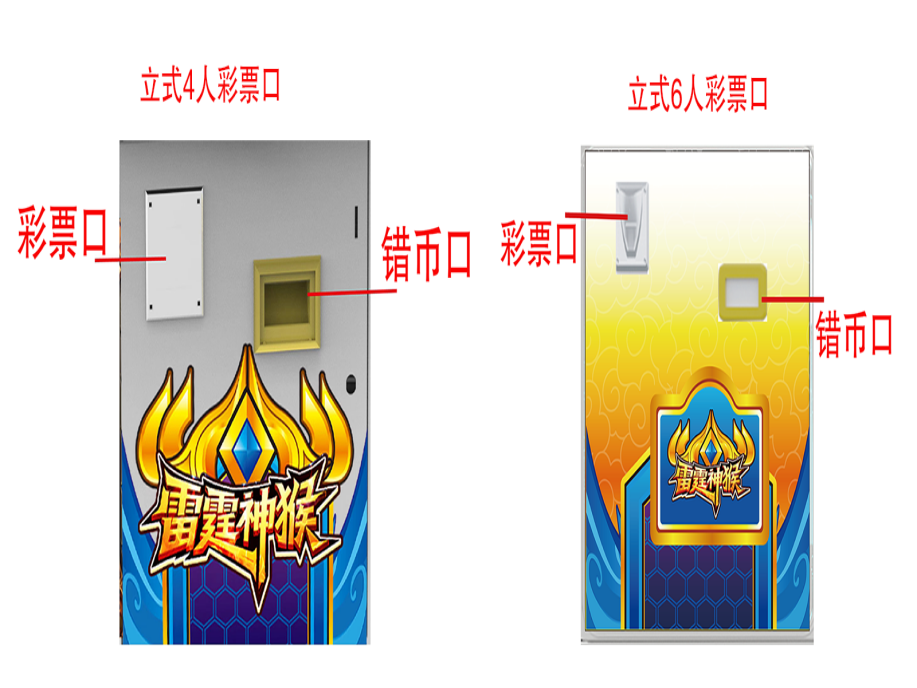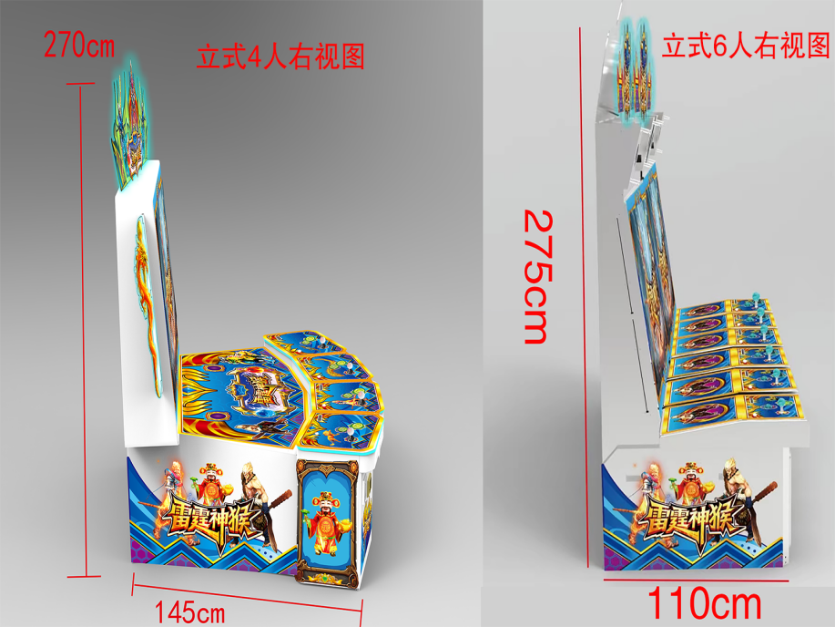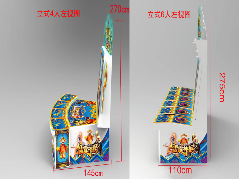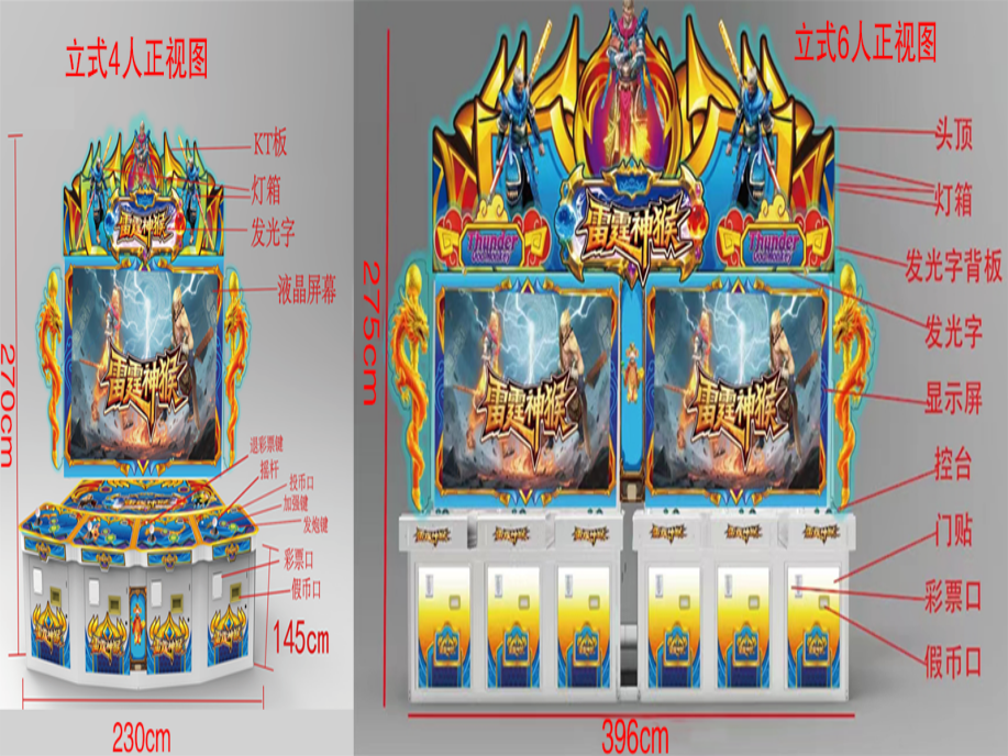游戏内容简介 | 【雷霆神猴(立式)】是为大众娱乐而设计的一款4人,6人玩的娱乐游戏游艺设备,此设备游戏包含打鱼,打鸟,打怪三种玩法。本机支持合法合规的管理系统,也可通过打开微信或支付宝扫一扫管理系统卡头二维码/屏幕二维码/实体二维码扫码支付投币或投入实体游戏代币等方式获得对应的能量积分后玩家即可开始游戏。本机适用于网咖、竞技馆、动漫城、商超、台球俱乐部等符合经营许可的使用场所。本设备是一款模拟射击退彩票游戏,游戏代币只在机台内部循环不退代币,玩家在游戏中作为猎人的角色,可射击到多种海洋鱼类/丛林鸟类/丛林怪类的角色,包括金牛,金象,金狮,金龙,鳄鱼,麒麟,哪吒,悟空等。除了让你感受绚丽多彩,缤纷有趣的海洋世界外,还能享受到捕获多种鱼类鸟类的惊喜。本游戏画面逼真、新奇;游戏操作简单、直观;游戏中有诸多的小游戏;同时游戏有很炫的特效,给玩家带来视觉享受。游戏操作简单有趣,最终按照玩家捕获的数量获得相应的彩票奖励,提供给玩家一个趣味十足的游乐世界,适合成人及亲子娱乐。本游戏画面逼真、新奇;游戏操作简单、直观;游戏设备超高清晰液晶显示屏,无论是画面精致细腻程度,或者是颜色的协调,还是光影投射的效果,都逼真的近乎完美,加上美妙的音乐,给玩家带来有身临其境的感觉.玩家在游戏的过程中可欣赏到海洋鱼类在追逐,天空飞鸟在翱翔,丛林怪类在奔跑,互动所带来的自身的真实感受。体验射击游戏精彩带来的喜悦,让玩家回味无穷,游戏结束后,玩家可用获得的能量积分手动选择退实物彩票/电子彩票/积分/礼品/礼品积分卡,可到店面吧台用彩票/电子彩票/积分/礼品积分卡兑换精美礼品,也可以链接到电子商城上选择心仪的礼品,使用彩票/电子彩票/能量积分/礼品积分卡兑换,填写正确的收货地址,商城将精美礼品通过快递送达。同时为了顺应“互联网+” 发展趋势,鼓励娱乐场所与互联网结合发展,实现场内场外、线上线下互动,增强娱乐场所体验式服务”的要求,本设备可以通过物联网技术把实体游戏游艺设备的游戏内容推送到移动端供客人游玩,仅限于从实体设备所在的公众号、小程序、APP及网络推广平台入口进入的玩家游玩。 | ||