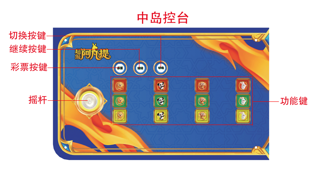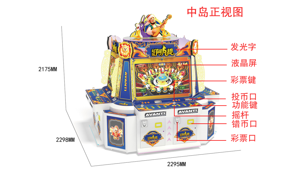 游戏内容简介 | 【超级阿凡提(中岛)】是为大众娱乐而设计的一款游戏游艺彩票机,本机支持合法合规的管理系统,也可通过打开微信或支付宝扫一扫管理系统卡头二维码/屏幕二维码/实体二维码扫码支付投币或投入实体游戏代币等方式获得对应的竞猜积分后,玩家即可开始游戏/或等待机器自动倒计时。 本机适用于网咖、竞技馆、动漫城、商超、台球室等符合经营许可的使用场所。本游戏以全新的玩法,丰富的卡通角色,游戏中每个角色都有不同的技能,玩家通过竞猜体验公平公正的游戏过程。 游戏里有四个不同的动物(霸气狮王、优雅熊猫、顽皮猴子和可爱兔子),还有一个超级阿凡提动漫人物形象,它们在屏幕中间围成一个圆形,游戏开始前,玩家给自己喜欢的动物及颜色加油投票,开始竞猜。游戏开始后,屏幕中间有一个指针转盘开始快速转动,并慢慢停止,当指针完全停止在某一个动物及其颜色面前时,游戏结束。如果指针指向的动物及颜色和玩家支持加油的动物及颜色完全一致,即可获得相应的积分和彩票。每一轮每个动物及颜色的数量随机出现,猜中后获得的积分(彩票)数量也会有所不同。 除了指针,游戏中还不定时奉送各种小游戏(中超级阿凡提时,超级阿凡提会随机送3-7个动物作为奖励,大彩金根据玩家加油票数累积后随机赠送,明牌三选一会提前告诉玩家本局会从三个动物中出一个,猜中的概率大大增加,明牌六选一同理会提前告诉玩家本局会从六个动物中竞猜)。玩家可以用获得的积分选择退实物彩票/电子彩票/积分卡等,到服务台兑换相应礼品,或者到电子商城兑换精彩礼品,只要天下正确的收货地址,商城即可通过快递送达。 为了顺应“互联网+”发展趋势,鼓励娱乐场所与互联网结合发展,实现场内场外、线上线下互动,增强娱乐场所体验式服务要求,本设备可以通过物联网技术把实体游戏游艺设备的游戏内容推送至客户端供客人娱乐,仅限于从实体设备所在的公众号、小程序、APP及网络推广平台入口进入的游戏玩家。 | ||