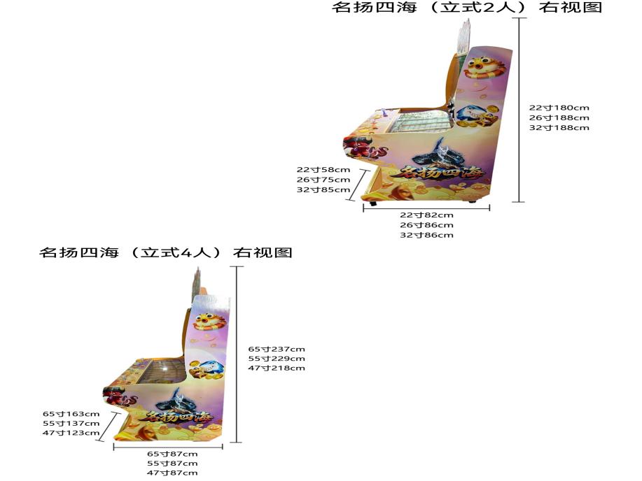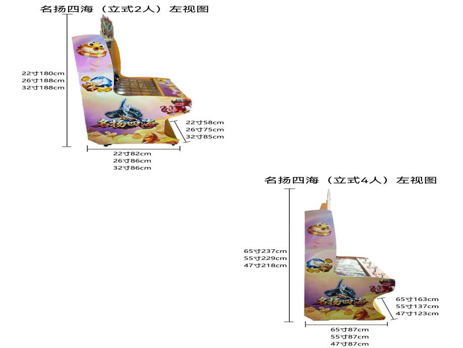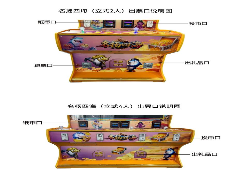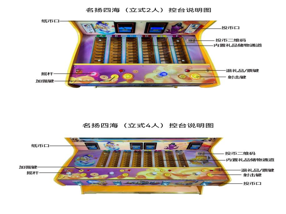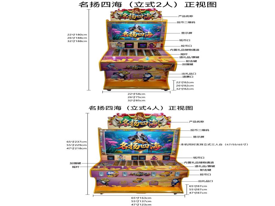 游戏内容简介 | 《名扬四海(立式)》是为大众娱乐而设计的一款游戏游艺彩票/礼品机,本机支持合法合规的管理系统,也可通过打开微信或支付宝扫一扫管理系统卡头二维码/屏幕二维码/实体二维码扫码支付投币或投入实体游戏代币获得对应的电子积分子弹数后玩家即可手动启动游戏。本机适用于网咖、竞技馆、动漫城、商超、台球俱乐部等符合经营许可的使用场所。本游戏可选:多场景+海洋生物+异兽+道具为游戏题材,多场景+鸟类生物+异兽+道具为游戏题材,多场景+昆虫生物+异兽+道具为游戏题材。(比如鱼类题材一:小丑鱼、锦鲤、蓝吊鱼、刺尾鱼、唐王鱼、灯笼鱼、变异贝壳、海马、小螃蟹、变异章鱼、孔雀鱼、小龙虾、海狮、海龟、变异牛头虎鲸、船型鲨鱼、彩凤、蓝紫凤、海豚、幸运大奖JP彩金、红鱼王、闪电鱼、海龟钻头炮、海龟电碰炮、海龟连环炸弹、珍珠蚌集满五个送彩金、七星神剑、莲花炸弹、财神拍拍乐、神龙飞马、神兽觉醒、恶龙、鱼美人、嫦娥仙子、金龙、龙王敖广全屏炸弹、各类型鱼类组合等等。鱼类题材二:雀鲷鱼、石斑鱼、狮子鱼、斑斓鱼、刺豚鱼、蓝吊鱼、灯笼鱼、乌龟、吊尾鱼、蝴蝶鱼、马尾鱼、先锋鱼、海藻、魔鬼鱼、银鲨、金鲨、变异小麒麟、螃蟹火焰弹、招财猫开心30秒、疯狂鱼叉、帆船一网打尽、礼品美人鱼、随机礼品美人鱼、全中礼品美人鱼、螃蟹电磁炮、螃蟹钻头炮、螃蟹连环炸弹、金色摇钱树、红包、闪电连锁、小财神、金龙、金色飞马、礼品转盘、章鱼超级炸弹、鲨鱼全屏炸弹、龙王敖广全屏炸弹等等。鸟类题材:里面有各式各样的蝴蝶类,各式各样的老鹰类,各式各样的鸟类等等。虫类题材:各式各样的昆虫类等等)。由多种不同风格的场景,众多各具特色的海洋生物/鸟类生物/虫类生物/异兽/道具身上蕴藏着无尽的秘密,等待着勇敢的玩家深入探索,体验一场视觉盛宴。在射击过程中击杀龙王敖广全屏炸弹、章鱼超级炸弹、鲨鱼全屏炸弹可以获得超级大奖,让玩家获得丰厚的彩票/电子积分奖励。同时在游戏中,玩家在射击任意海洋生物/鸟类生物/虫类生物/异兽/道具时,会消耗电子积分子弹数,击杀任何的海洋生物/鸟类生物/虫类生物/异兽/道具都会得到该海洋生物/鸟类生物/虫类生物/异兽/道具相对应的彩票/电子积分奖励,当玩家电子积分子弹数为零时则游戏结束。本设备支持多台设备联机游玩。支持立式三人台:四十七以及五十五液晶显示。设备亚克力头顶可拆卸。游戏结束后玩家可用获得的积分奖励手动选择退实物彩票/电子彩票/电子积分/礼品/礼品积分卡,可到店面吧台用实物彩票/电子彩票/电子积分/礼品积分卡兑换精美礼品。玩家也可以选择退电子彩票/电子积分直接返还到玩家手机上,也可以用手机扫卡头/屏幕二维码领取电子彩票/电子积分,都可以链接到电子商城上选择心仪的礼品使用电子彩票/电子积分/礼品积分卡兑换。同时为了“顺应“互联网+”发展趋势,鼓励娱乐场所与互联网结合发展,实现场内场外、线上线下互动,增强娱乐场所体验式服务”的要求,本设备可以通过物联网技术把实体游戏游艺设备的游戏内容推送到移动端供客人游玩,仅限于从实体设备所在的公众号、小程序、APP及网络推广平台入口进入的玩家游玩。 | ||