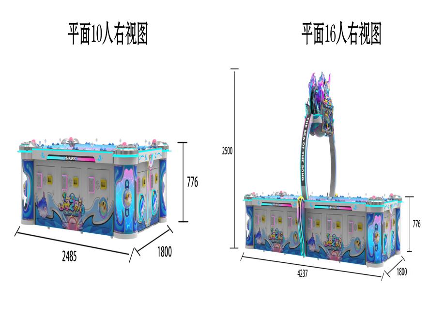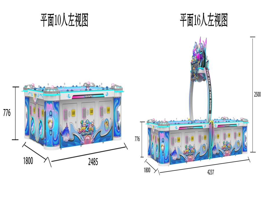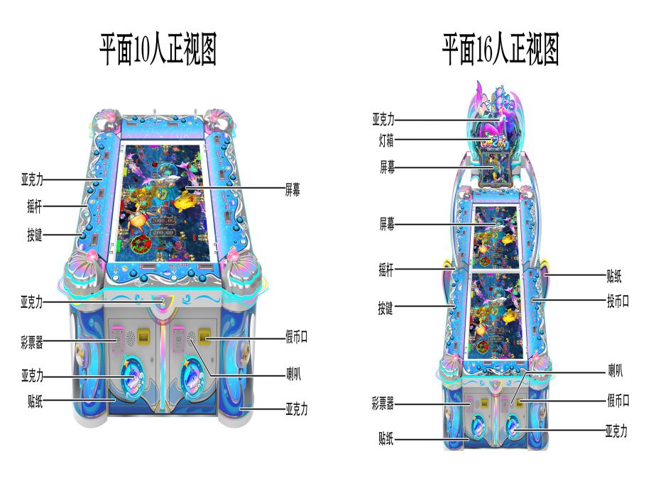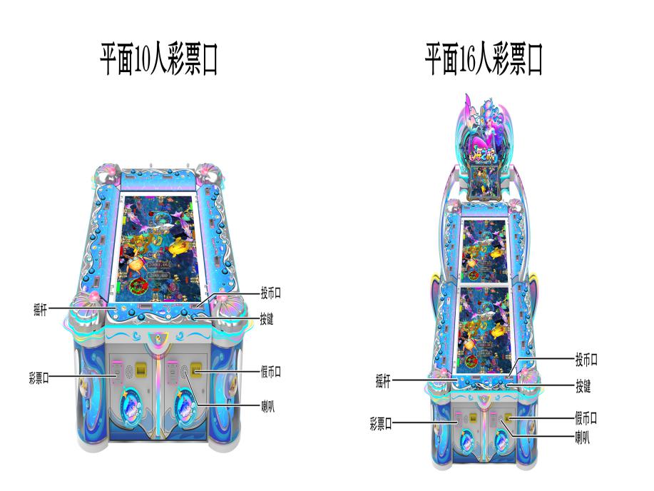 游戏内容简介 | 《海之歌(平面10/16人)》是为大众娱乐而设计的一款射击类游戏游艺彩票机,本机支持合法合规的管理系统。也可通过打开微信或支付宝扫一扫管理系统卡头二维码/屏幕二维码/实体二维码扫码支付投币或投入实体游戏代币获得对应的能量积分子弹数后玩家即可手动启动游戏。本机适用于网咖、竞技馆、动漫城、商超、台球俱乐部等符合经营许可的使用场所。本游戏是以多场景+海洋生物+异兽+道具为题材(比如:小橙鱼,碧波鱼,赤纹狮王,翠纹鱼,独眼蟹,金翅蝶鱼,利齿绿河豚,黄色神仙鱼,焰尾灯笼鱼,玄甲幼龟,魔法泡泡,赤甲龙虾,圣诞小胖鱼,涡轮飞鱼,深海剑鱼,星空蝠魟,白银战鲨,黄金战鲨,深海龙鱼,上古金龙,红色锦鲤,巨口灯笼怪,七彩美人鱼,金甲蟹,雷霆爆弹,双子雷霆爆弹,百变章鱼,孔雀鱼幸运轮,蝠魟幸运轮,剑鱼幸运轮,银鲨幸运轮,金鲨幸运轮,三色幸运轮,蝠魟四重奏,剑鱼双雄,五福临门,海王之戟,闪电光环火龙虾,闪电光环圣诞鱼,闪电光环涡轮鱼,闪电光环剑鱼,赤色连锁,赤色双连锁,赤色三连锁,)等等,由多种不同风格的场景,众多各具特色的海洋生物+异兽+道具身上蕴藏着无尽的秘密,等待着勇敢的玩家深入探索,体验一场视觉盛宴。同时在游戏中,玩家在射击任意海洋生物+异兽+道具时,会消耗能量积分子弹数,击杀任何的海洋生物+异兽+道具都会得到该海洋生物+异兽+道具相对应的彩票/能量积分奖励,当玩家能量积分子弹数为零时则游戏结束。同时支持立式四十三寸,六人五十寸以及平板六十五寸。玩家可用获得的能量积分手动选择退实物彩票/电子彩票/积分/礼品积分卡,到店面吧台用实物彩票/电子彩票/积分/礼品积分卡兑换精美礼品。玩家也可以选择退电子彩票/能量积分直接返还到玩家手机上,也可以用手机扫卡头/屏幕二维码领取电子彩票/能量积分,都可以链接到电子商城上选择心仪的礼品使用电子彩票/能量积分/礼品积分卡兑换。同时为了“顺应“互联网+”发展趋势,鼓励娱乐场所与互联网结合发展,实现场内场外、线上线下互动,增强娱乐场所体验式服务”的要求,本设备可以通过物联网技术把实体游戏游艺设备的游戏内容推送到移动端供客人游玩,仅限于从实体设备所在的公众号、小程序、APP 及网络推广平台入口进入的玩家游玩。 | ||