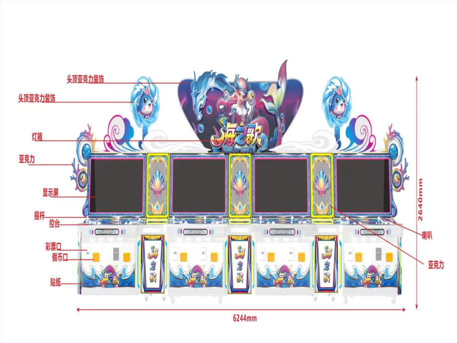 游戏内容简介 | 《海之歌(立式8人)》是为大众娱乐而设计的一款游戏游艺彩票机,本机支持合法合规的管理系统。也可通过打开微信或支付宝扫一扫管理系统卡头二维码/屏幕二维码/实体二维码扫码支付投币或投入实体游戏代币获得对应的能量积分子弹数后玩家即可手动启动游戏。本机适用于网咖、竞技馆、动漫城、商超、台球俱乐部等符合经营许可的使用场所。本游戏是以多场景+海洋生物+异兽+道具为题材(比如:小橙鱼,碧波鱼,赤纹狮王,翠纹鱼,独眼蟹,金翅蝶鱼,利齿绿河豚,黄色神仙鱼,焰尾灯笼鱼,玄甲幼龟,魔法泡泡,赤甲龙虾,圣诞小胖鱼,涡轮飞鱼,深海剑鱼,星空蝠魟,白银战鲨,黄金战鲨,深海龙鱼,上古金龙,红色锦鲤,巨口灯笼怪,七彩美人鱼,金甲蟹,雷霆爆弹,双子雷霆爆弹,百变章鱼,孔雀鱼幸运轮,蝠魟幸运轮,剑鱼幸运轮,银鲨幸运轮,金鲨幸运轮,三色幸运轮,蝠魟四重奏,剑鱼双雄,五福临门,海王之戟,闪电光环火龙虾,闪电光环圣诞鱼,闪电光环涡轮鱼,闪电光环剑鱼,赤色连锁,赤色双连锁,赤色三连锁,)等等,由多种不同风格的场景,众多各具特色的海洋生物+异兽+道具身上蕴藏着无尽的秘密,等待着勇敢的玩家深入探索,体验一场视觉盛宴。同时在游戏中,玩家在射击任意海洋生物+异兽+道具时,会消耗能量积分子弹数,击杀任何的海洋生物+异兽+道具都会得到该海洋生物+异兽+道具相对应的彩票/能量积分奖励,当玩家能量积分子弹数为零时则游戏结束。同时支持立式四十三寸,六人五十寸以及平板六十五寸。玩家可用获得的能量积分手动选择退实物彩票/电子彩票/积分/礼品积分卡,到店面吧台用实物彩票/电子彩票/积分/礼品积分卡兑换精美礼品。玩家也可以选择退电子彩票/能量积分直接返还到玩家手机上,也可以用手机扫卡头/屏幕二维码领取电子彩票/能量积分,都可以链接到电子商城上选择心仪的礼品使用电子彩票/能量积分/礼品积分卡兑换。同时为了“顺应“互联网+”发展趋势,鼓励娱乐场所与互联网结合发展,实现场内场外、线上线下互动,增强娱乐场所体验式服务”的要求,本设备可以通过物联网技术把实体游戏游艺设备的游戏内容推送到移动端供客人游玩,仅限于从实体设备所在的公众号、小程序、APP 及网络推广平台入口进入的玩家游玩。 | ||