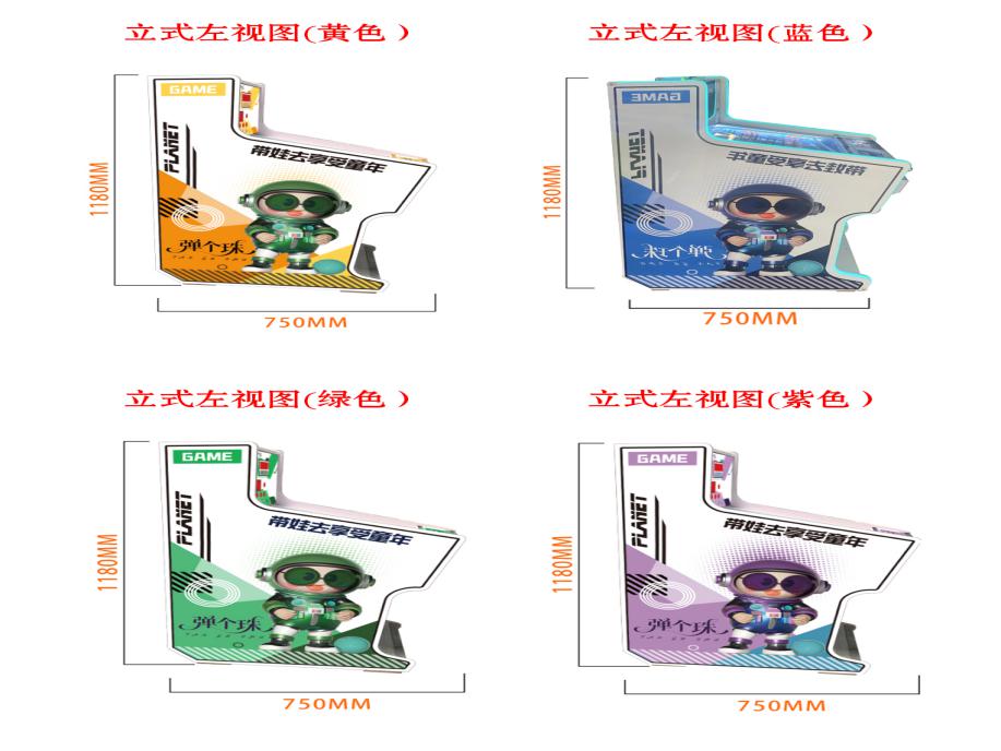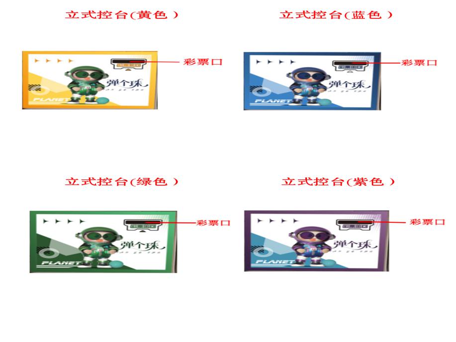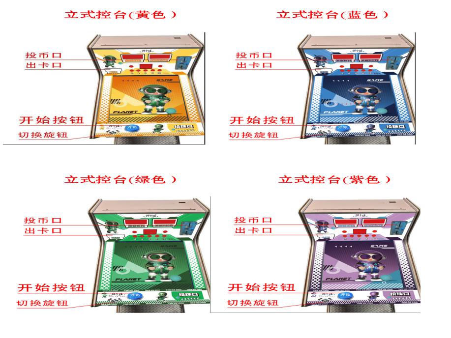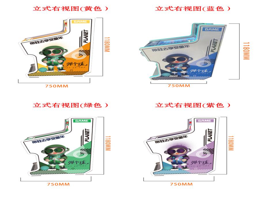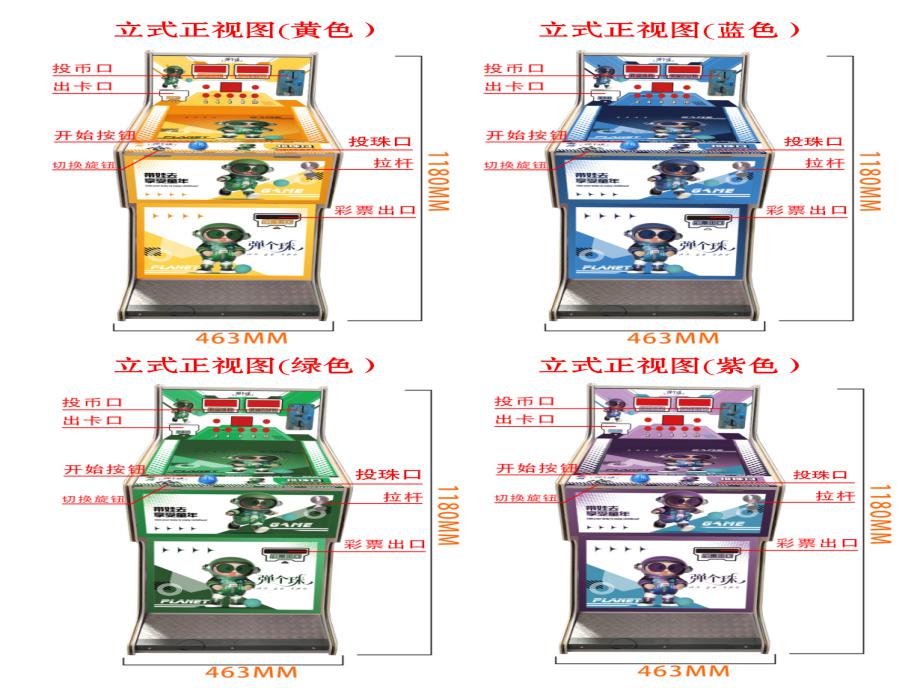 游戏内容简介 | 《弹个珠(立式)》是我公司专为大众娱乐而自主设计研发的一款陶瓷珠竞技游戏,是一款趣味性很强的弹球竞技性互动游戏设备,本设备外观集合潮玩元素设计,多款颜色设计(黄色、绿色、蓝色、紫色),采用木板、亚克力和五金等材料完美结合。本机适用于动漫城、超市、商超、台球俱乐部、电影院等符合经营许可的使用场所。该机台支持合法合规的管理系统,可扫描二维码打开微信或支付宝扫一扫乐园管理系统二维码或屏幕二维码,选择支付套餐,进行支付购买陶瓷珠等,购买完陶瓷珠之后可以开始游戏,通过复刻传统儿童玻璃弹珠机玩法,结合潮流场景与趣味机关设计,唤醒家长与孩子对童年的美好记忆。设备通过玩家控制力道拉动拉杆,弹出小球,经过各种障碍物后进入亮灯通道,从而获得不同数量的各种潮玩卡片,通过手眼协调操作锻炼玩家的专注力与控制力,打造兼具趣味性、教育性与健康价值的娱乐体验。游戏有一条发射通道,5条奖励通道,加上各种由亚克力、铁钉和胶圈制作的障碍物。游戏开始后,小球需要经过发射通道,再经过各种障碍物,再进入到其中一个奖励通道中。不同的通道,对应的奖励卡片数量不同。按开始键开始游戏,按完开始键后奖励通道上的灯会随机亮起,玩家这时要判定自己的力度,分析小球可能会经过哪些障碍,最终到达想到去到的通道中。分析结束,玩家可以拉动弹簧装置来让小球从发射通道发射出去,小球会在经过各种障碍后,随机进入某个奖励通道,若该通道灯亮,则中奖,如该通道灯不亮,则未中奖。未中奖,则小球再次回到起点,玩家可以重新进入下一轮游戏,如中奖,则设备根据中奖通道不同给出相应不同的奖励。左侧卡片出口会自动退出相应的奖励潮玩卡片和陶瓷珠等。奖励的潮玩卡片和弹珠玩家可以自己带回家收集,也可兑换成积分,到店里选择心仪的礼品,使用积分兑换。游戏让玩家既获得体验感,又能锻炼玩家的分析判断的能力,力量的控制能力,音乐生动有趣,玩法简单,深受各个年龄段玩家朋友喜爱。 | ||