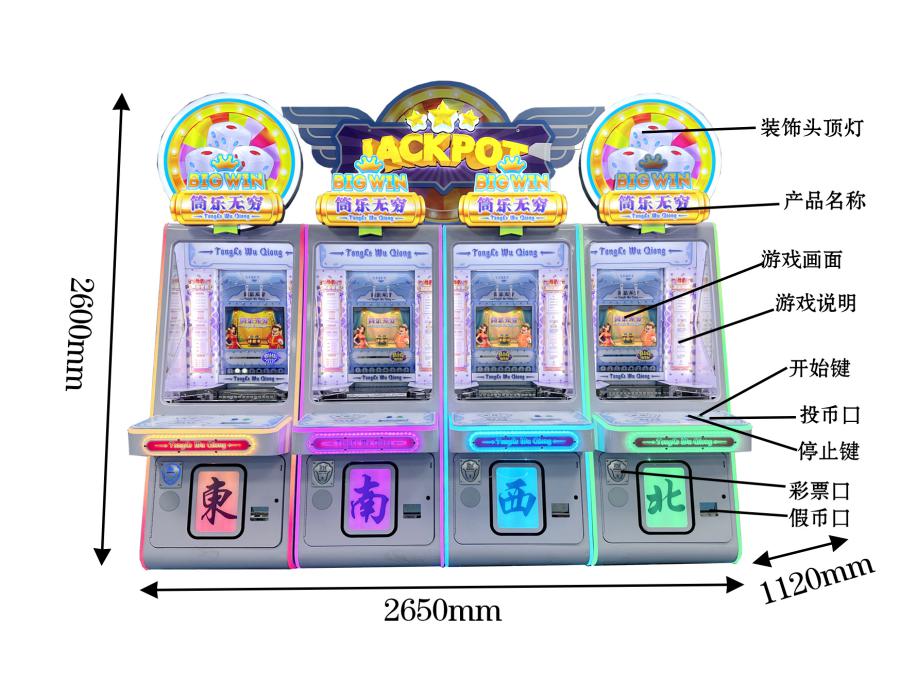 游戏内容简介 | 《筒乐无穷(立式 1-30 人位)》是为大众娱乐而设计的一款以推推乐为主题的推币类游戏游艺娱乐设备,本机支持合法合规的管理系统, 也可通过打开微信或支付宝扫一扫管理系统卡头二维码/屏幕二维码/实体二维码 扫码支付投币或投入实体游戏代币后玩家即可开始游戏。本机适用于网咖、竞技馆、动漫城、商超、台球俱乐部等符合经营许可的使用场所筒乐无穷》配有岛式 4 人。立式 1 人,立式 3 人连线,立式 4 人连线,立式 5 人连线机型, 可连接 30 位,多款颜色设计(颜色:白色、绿色、蓝色、黄色、红色)。《筒乐无穷》该游戏游艺设备以麻将为主要题材,融入堆币叠币推推乐的游戏玩法,包含了非常丰富的麻将特殊元素:如红中、八万、一筒、4条、七万、七条、伍筒、东风、一条;让整个游戏感受到浓浓的关于筒乐无穷》的气息。设备只退彩票不退币掉落的游戏代币只在机器内部循环不会掉落在机器外部。这运通道里,来启动屏幕里的小游戏,从而获得更多代币奖励掉落到堆盘。如果落入幸运通道,则启动屏幕小游戏:小玛利、叠叠乐、寻宝图、JP1、JP2、JP3, 当有三个红中图案出现在屏幕不同的位置时,就获得小游戏的额外奖励,获得更多从机器最顶端掉代币奖励到堆盘;如果游戏代币直接掉落到堆盘时,则堆盘推动游戏代币前进和叠加,当游戏代币滑落堆盘时,玩家可获得彩票奖励。小游戏;1 配备开心 30 秒,2 寻宝图,3一推到底,4彩金翻倍等小游戏。同时玩家可用获得的彩票奖励手动选择退实物彩票/电子彩票,可到店面吧台用彩票/电子彩票兑换精美礼品,也可以用手机扫卡头/屏幕二维码领取电子彩票,都可以链接到电子商城上选择心仪的礼品使用彩票/电子彩票兑换,填写正确的收货地址,商城将精美礼品通过快递送达。同时为了“顺应“互联网+”发展趋势,鼓励娱乐场所与互联网结合发展,实现场内场外、线上线下互动,增强娱乐场所体验式服务”的要求,本设备可以通过物联网技术把实体游戏游艺设备的游戏内容推送到移动端供客人游玩,仅限于从实体设备所在的公众号、小程序、APP 及网络推广平台入口进入的玩家游玩。 | ||