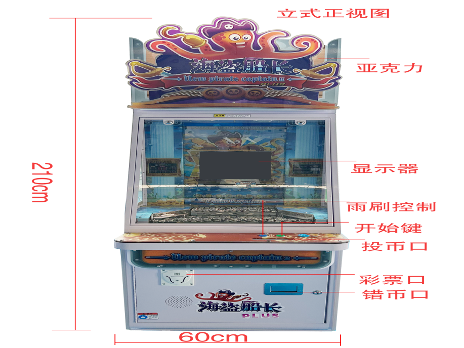 游戏内容简介 | 【海盗船长PLUS(立式1-30人位)】是为大众娱乐而设计的一款以推推乐为主题的推币类游戏游艺娱乐设备,本机支持合法合规的管理系统,也可通过打开微信或支付宝扫一扫管理系统卡头二维码/屏幕二维码/实体二维码扫码支付投币或投入实体游戏代币后玩家即可开始游戏。本机适用于网咖、竞技馆、动漫城、商超、台球俱乐部等符合经营许可的使用场所。《海盗船长PLUS》配有岛式4人。立式1人,立式3人连线,立式4人连线,立式5人连线机型,可连接30位,多款颜色设计(颜色:白色、绿色、蓝色、黄色、红色)。该游戏游艺设备以海盗、航海为主要题材,融入堆币叠币推推乐的游戏玩法,包含了非常丰富的航海元素:如海盗船长、指南针、船长配刀、鹦鹉、船锚、船舵、漂流瓶、望远镜、寻宝图;让整个游戏感受到浓浓的关于《海盗船长PLUS》的气息。设备只退彩票不退币掉落的游戏代币只在机器内部循环不会掉落在机器外部。这款设备的游戏技巧有两个方面,第一技巧是玩家通过确认键将雨刷停在合适的角度,绕开钉板以控制游戏代币掉落到自己想要的位置,第二个技巧就是玩家要掌握时机,在合适的时机快速投币使币掉落在左右移动的幸运通道里,来启动屏幕里的小游戏,从而获得更多代币奖励掉落到堆盘。如果落入幸运通道,则启动屏幕小游戏:小玛利、叠叠乐、寻宝图、JP1、JP2、JP3,当有三个海盗船长图案出现在屏幕不同的位置时,就获得小游戏的额外奖励,获得更多从机器最顶端掉代币奖励到堆盘;如果游戏代币直接掉落到堆盘时,则堆盘推动游戏代币前进和叠加,当游戏代币滑落堆盘时,玩家可获得彩票奖励。小游戏;1配备开心30秒,2寻宝图等小游戏。玩家可用获得的实物彩票/电子彩票,可到店面吧台用彩票/电子彩票兑换精美礼品,电子彩票直接返还到玩家手机上或玩家用手机扫系统二维码/屏幕二维码领取相应奖励,获得实物彩票按经营方合规方式选择心仪的礼品使用(礼品需符合国家法律及当地政策的规定)。同时为了“顺应“互联网+”发展趋势,鼓励娱乐场所与互联网结合发展,实现场内场外、线上线下互动,增强娱乐场所体验式服务”的要求,本设备可以通过物联网技术把实体游戏游艺设备的游戏内容推送到移动端供客人游玩,仅限于从实体设备所在的公众号、小程序、APP及网络推广平台入口进入的玩家游玩。 | ||