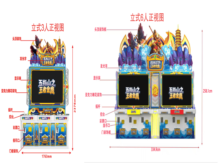 游戏内容简介 | 【五指山之王者金鹰(立式)】是为大众娱乐而设计的娱乐游戏游艺设备,本机支持合法合规的管理系统,也可通过打开扫一扫管理系统二维码/屏幕二维码/实体二维码扫码支付投币或投入实体游戏代币获得对应的子弹数后玩家即可手动启动游戏。本机适用于网咖、竞技馆、动漫城、商超、台球俱乐部等符合经营许可的使用场所。该设备是一款集海洋鱼类和天空飞鸟射击模拟游戏,玩家在游戏中作为猎人的角色,可射击到多种海洋鱼类,包括大迦鳅鱼、小丑鱼、河豚、狮子鱼、乌龟、旗鱼、灯笼鱼、锯齿鲨、组队鱼群,霸王龟,金色龙龟,深海鳄鱼等,鱼儿游过深海、圳瑚、海底的各种奇幻世界。除了让你感受绚丽多彩,缤纷有趣的海底世界外,还能享受到捕获鱼儿的惊喜。本游戏画面逼真、新奇;游戏操作简单、直观:玩家通过遥杆及按键操控发射炮弹,收获射击鱼儿的趣味,打中目标获得相应的奖励,最终按照玩家捕获数量获得彩票。游戏设备超高清晰液晶显示屏,无论是画面精致细腻程度,或者是颜色的协调,还是光影投射的效果,都逼真的近乎完美,加上美妙的音乐,令玩家爱不释手,欢乐无穷。在游戏的过程中,效果绚丽震撼,提供给玩家一个趣味十足的游乐世界,适合成人及亲子娱乐。当以森林天空猎鸟为主题时,玩家犹如进入了鸟的天堂,沉浸在鸟语花香,与五彩缤纷的世界相融,同类鸟,闪电鸟,充满趣味和益智性适合各个年龄段的玩家,在整个冲关过程中锻炼了玩家的手眼协调性和提高玩家注意力。当以怪兽为主题时,游戏的地图丰富,游戏开始后多种兽王随机出现,游戏玩家火力集中击杀各种兽王以及boss后可获得相应的能量值,获得的能量可以继续攻击更多魔怪以及boss,游戏玩法生动有趣,在游戏中让玩家挑战自我极限,游戏中出现的妖怪以及boss.万倍轮盘,雷凤凰,火凤凰,雷神,巨型蛛,铁甲战士,天使蛋,地狱三头犬钻头磨,炸弹,闪电虎,狼骑斗士,冰原狼人,旋风怪,巨石人,连环炸弹,魔王随从等。玩家使用子弹,自由选择攻击当前屏幕上出现的妖怪以及boss,游戏过程中不定期的出现妖风清扫,来助力玩家消灭妖怪,击倒兽王,赠送威力强大的神奇武器,玩家既获得体验感,又能提高免疫力,又能获得通关的乐趣,玩家可以使用多种不同的子弹体验多种不同的设计效果。当以人物为主题时,行云流水的战斗系统: 融合了兵器切换、武技连招与元素附魔,每一场战斗都如舞蹈般华丽且充满策略。精准闪避触发“时缓”,完美格挡震碎敌人架势,给予致命一击! 自由搭配上百种技能符文,锻造和强化传奇武器装备,应对各种强大的敌人。令人震撼的Boss挑战高达数十米的深渊巨兽和诡计多端的堕落神明。每个Boss都有独特的机制和多阶段形态,胜利带来的成就感无与伦比。游戏结束后,玩家可用获得的实物彩票/电子彩票,可到店面吧台用彩票/电子彩票兑换精美礼品,电子彩票直接返还到玩家手机上或玩家用手机扫系统二维码/屏幕二维码领取相应奖励,获得实物彩票按经营方合规方式选择心仪的礼品使用(礼品需符合国家法律及当地政策的规定)。同时为了“顺应“互联网+”发展趋势,鼓励娱乐场所与互联网结合发展,实现场内场外、线上线下互动,增强娱乐场所体验式服务”的要求,本设备可以通过物联网技术把实体游戏游艺设备的游戏内容推送到移动端供客人游玩,仅限于从实体设备所在的公众号、小程序、APP及网络推广平台入口进入的玩家游玩。 | ||