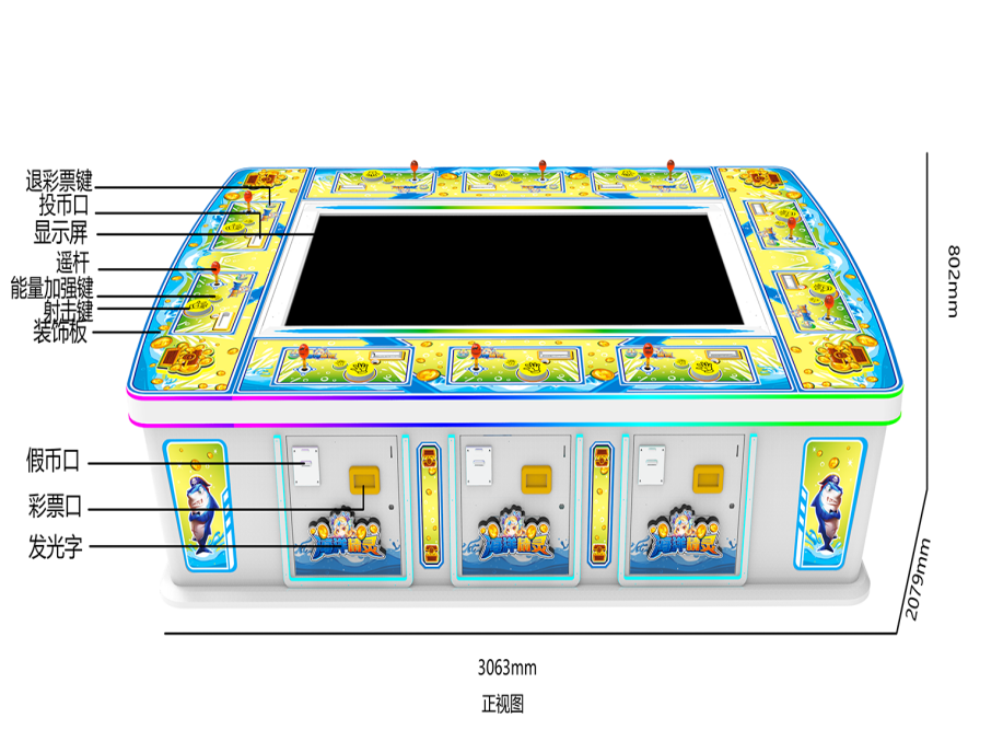 游戏内容简介 | 【海洋精灵(平板10人)】是一款模拟射击退彩票游戏,本机支持合法合规的管理系统,也可通过打开微信或支付宝扫一扫管理系统卡头二维码/屏幕二维码/实体二维码扫码支付投币或投入实体游戏代币等方式获得对应的能量竞猜积分后玩家即可手动启动游戏或机器目动倒计时。玩家在游戏中作为猎人的角色,可射击到多达30种海洋鱼类,包括(大迦鳅鱼、小丑鱼、大头鱼,蝴蝶鱼、乌龟、旗鱼、灯笼鱼、金鲨、银鲨,白鲨,棕鲨,魔鬼鱼,鳄鱼,深海巨鳄、斑斓鱼、河马、水母,海豚,金龙,精灵,各种小鱼群)等,游过深海、珊瑚、海底的各种奇幻世界。除了让你感受绚丽多彩,缤纷有趣的海底世界外,还能享受到捕获多种鱼儿的惊喜。本游戏画面逼真、新奇;游戏操作简单、直观;游戏中有诸多的小游戏;同时游戏有很炫的特效,给玩家带来视觉享受。游戏操作简单有趣,最终按照玩家捕获数量获得彩票奖励,提供给玩家一个趣味十足的游乐世界,适合成人及亲子娱乐。本游戏有限时免费的单人游戏,主游戏进行中,随机进入。玩家在时限内可免费捕鱼,快速连拍按钮可加快射击速度。过程中有机会额外获得更多奖励及免费游戏时间。本游戏画面逼真、新奇;游戏操作简单、直观;游戏设备超高清晰液晶显示屏,无论是画面精致细腻程度,或者是颜色的协调,还是光影投射的效果,都逼真的近乎完美,加上美妙的音乐,有各种海底生物在休闲游戏,音乐轻柔衬托,给玩家带来有身临其境感觉。玩家在游戏的过程中可欣赏到海底生物们在海底追逐互动所带来的自身的真实感受。体验射击游戏精彩带来的喜悦,让玩家回味无穷。提供给玩家一个趣味十足的游乐世界,适合成人及亲子娱乐。玩家可用获得的子弹数手动选择退实物彩票/电子彩票,可到店面吧台用彩票/电子彩票兑换精美礼品,也可以链接到电子商城上选择心仪的礼品使用彩票/电子彩票兑换,填写正确的收货地址,商城将精美礼品通过快递送达。同时为了“顺应“互联网+”发展趋势,鼓励娱乐场所与互联网结合发展,实现场内场外、线上线下互动,增强娱乐场所体验式服务”的要求,本设备可以通过物联网技术把实体游戏游艺设备的游戏内容推送到移动端供客人游玩,仅限于从实体设备所在的公众号、小程序、APP及网络推广平台入口进入的玩家游玩。 | ||