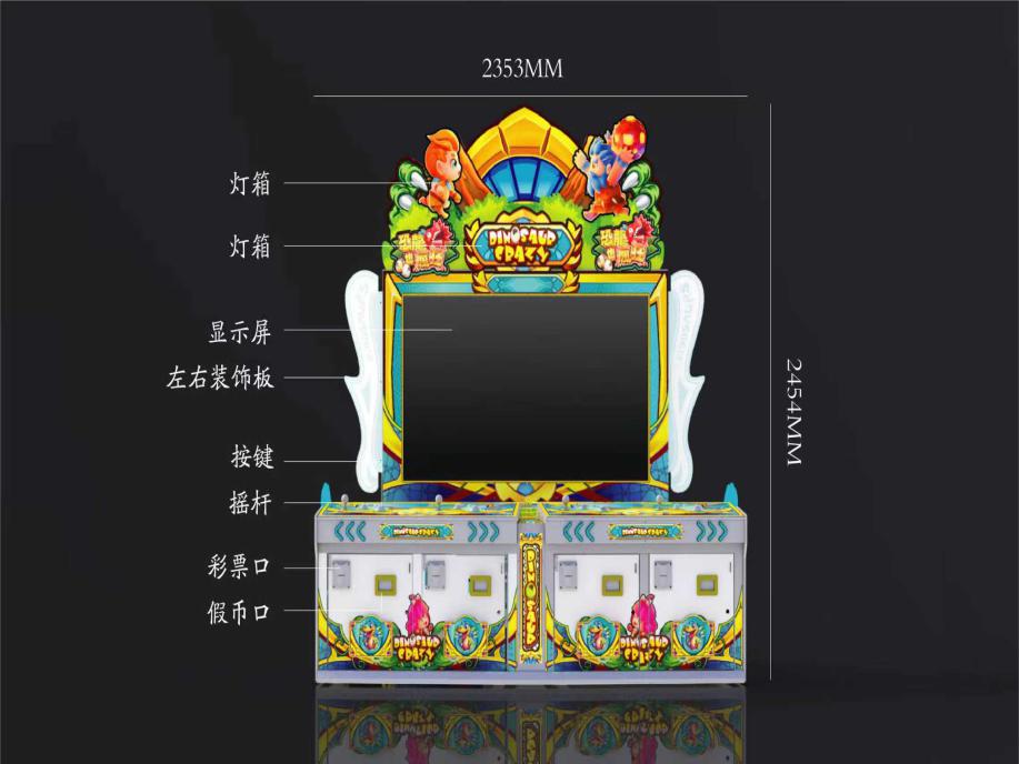 游戏内容简介 | 《恐龙也疯狂(立式4人)》是为大众娱乐而设计的一款支持单人/多人玩的游戏游艺彩票机,本机支持合法合规的管理系统,也可通过打开微信或支付宝扫一扫管理系统卡头二维码/屏幕二维码/实体二维码扫码支付投币或投入实体游戏代币获得对应的游戏分数和子弹数后玩家即可手动启动游戏。本机适用于网咖、竞技馆、动漫城、商超、台球俱乐部等符合经营许可的使用场所。本游戏是以多场景+陆地远古生物+异兽+道具为题材(比如:蛋蛋龙,鸟龙,双脊龙,甲龙,三角龙,剑齿虎,大双脊龙,大剑齿虎,大三角龙,红舞狮,黄舞狮,蓝舞狮,绿舞狮,刺甲龙,剑龙,棘龙,长颈巨龙,霸王龙,黄金剑龙,黄金剑齿虎,黄金霸王龙,符文魔像,冰柱,偷蛋龙,爆炸蛙,大象水枪,巨大龙骨,散射攻击,爆炸蛙,古巨鸡)等等,在这些生物的背后,是玩家们的智慧与能量的倾注,它们将在玩家的引导下,爆发出超越想象的战斗力。玩家们通过不懈的努力与智慧的累积,收集游戏分数,为这些生物名将赋予更为强大的力量,体验着运筹帷幄之中,决胜万里之外的非凡快感。随着这场盛大赛事的缓缓落幕,胜利的荣耀不仅为获胜的“生物勇士”们带来了丰厚的彩票奖励,更在无形中触动了人们内心深处对于自然界和谐共生理念的深刻共鸣。这场融合了娱乐性与教育意义的远古盛宴,绝非一场简单的竞技游戏所能概括,它更像是一首对生命多样性、智慧与勇气的崇高颂歌,回荡在无尽的深蓝之中,引领着人们去探索、去敬畏、去珍惜这个多彩多姿的生物远古时代。玩家可用获得的能量积分手动选择退实物彩票/电子彩票/礼品/礼品积分卡,到店面吧台用实物彩票/电子彩票/礼品积分卡兑换精美礼品。玩家也可以选择退电子彩票/彩票直接返还到玩家手机上,也可以用手机扫卡头/屏幕二维码领取电子彩票/彩票,都可以链接到电子商城上选择心仪的礼品使用电子彩票/彩票/礼品积分卡兑换。同时为了“顺应“互联网+”发展趋势,鼓励娱乐场所与互联网结合发展,实现场内场外、线上线下互动,增强娱乐场所体验式服务”的要求,本设备可以通过物联网技术把实体游戏游艺设备的游戏内容推送到移动端供客人游玩,仅限于从实体设备所在的公众号、小程序、APP 及网络推广平台入口进入的玩家游玩。 | ||