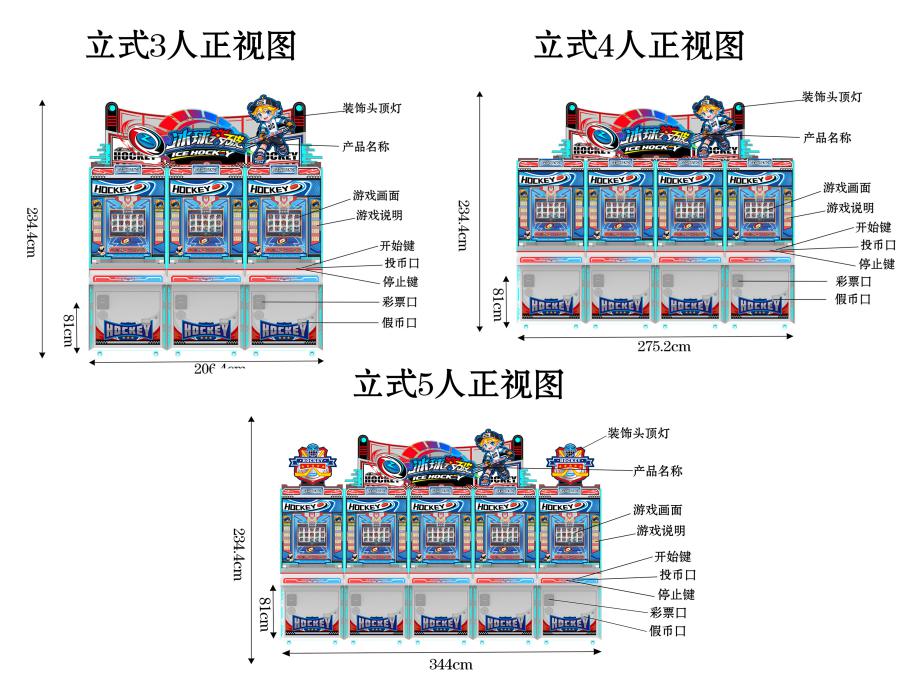 游戏内容简介 | 《冰球突破(立式3/4/5人)》是以冰球运动为主题的推币类游戏游艺娱乐设备,只退彩票不退币,掉落的游戏代币只在机器内部循环不会掉落在机器外部。本机支持合法合规的管理系统,也可通过打开微信或支付宝扫一扫管理系统卡头二维码/屏幕二维码/实体二维码扫码支付投币或投入实体游戏代币后玩家即可开始游戏。本机适用于网咖、竞技馆、动漫城、商超、台球俱乐部等符合经营许可的使用场所。《冰球突破》配有立式3人连线,立式4人连线,立式5人连线机型,设计新颖,绚丽多彩。《冰球突破》该游戏游艺设备以冰球运动、冰球器材为主要题材,融入堆币推推乐的游戏玩法,包含了非常丰富的冰球运动元素:如冰球突破、冰球头盔、白色进攻手、守门员、冰鞋、裁判、红色进攻手、铲冰车、冰球场地;让玩家在游戏过程中感受到浓浓的关于《冰球突破》的气息。这款设备的游戏技巧有两个方面,第一技巧是玩家通过确认键将雨刷停在合适的角度,绕开钉板以控制游戏代币掉落到自己想要的位置,第二个技巧就是玩家要掌握时机,在合适的时机快速投币使币掉落在左右移动的spin通道里,来启动屏幕里的七宫格转盘,从而获得更多代币奖励掉落到堆盘。如果落入spin通道,则启动屏幕七宫格转盘:冰球巅峰、极速穿梭、冰球盛宴、JP奖,获得更多从机器最顶端掉代币奖励到堆盘;如果游戏代币直接掉落到堆盘时,则堆盘推动游戏代币前进和叠加,当游戏代币滑落堆盘时,玩家可获得彩票奖励。同时玩家可用获得的彩票奖励手动选择退实物彩票/电子彩票,可到店面吧台用彩票/电子彩票兑换精美礼品,也可以用手机扫卡头/屏幕二维码领取电子彩票/彩票,都可以链接到电子商城上选择心仪的礼品使用彩票/电子彩票兑换,填写正确的收货地址,商城将精美礼品通过快递送达。同时为了“顺应“互联网+”发展趋势,鼓励娱乐场所与互联网结合发展,实现场内场外、线上线下互动,增强娱乐场所体验式服务”的要求,本设备可以通过物联网技术把实体游戏游艺设备的游戏内容推送到移动端供客人游玩,仅限于从实体设备所在的公众号、小程序、APP及网络推广平台入口进入的玩家游玩。 | ||