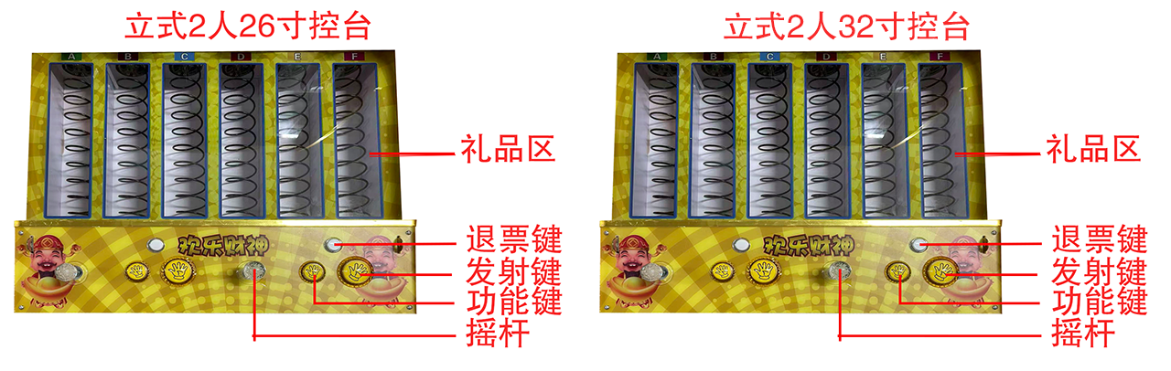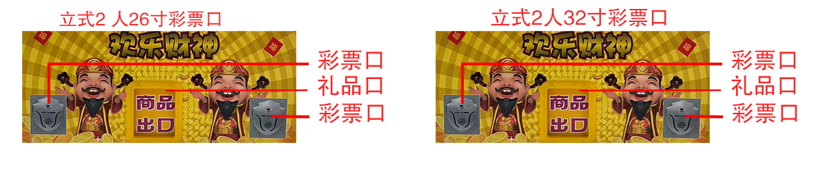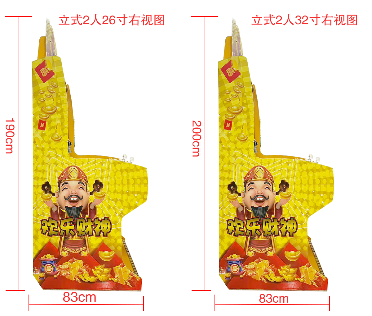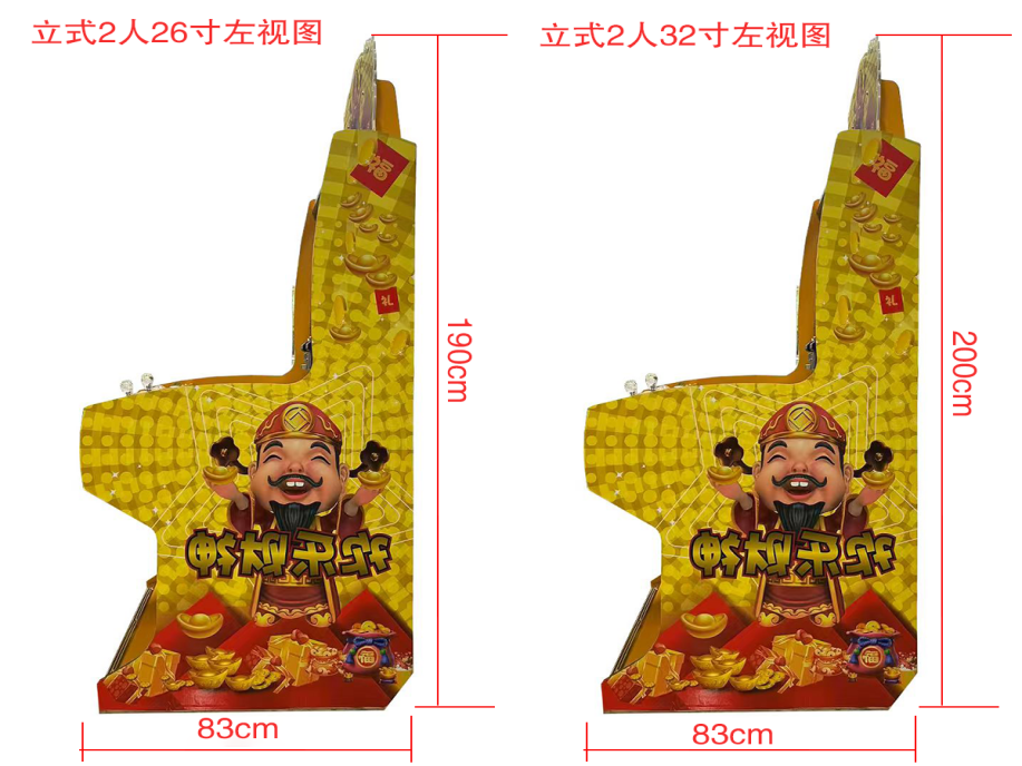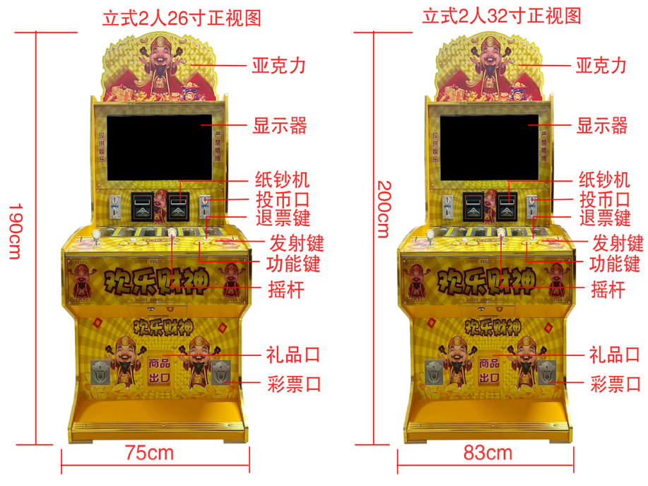 游戏内容简介 | 【欢乐财神(立式)】本游戏有2人,4人,6人,8人多种机型,欢乐财神游戏背景以梦幻般的深海作为游戏场景。是为大众娱乐而设计的一款支持单人玩/双人同时游玩的游戏游艺彩票/礼品机,本机支持合法合规的管理系统,也可通过打开扫一扫管理系统二维码/屏幕二维码/实体二维码扫码支付投币或投入实体游戏代币获得对应的子弹数后玩家即可手动启动游戏。本机适用于网咖、竞技馆、动漫城、商超、台球俱乐部等符合经营许可的使用场所。本游戏是以多场景+海洋生物+异兽+道具+天空飞鸟异兽为题材,玩家可以选择自己喜欢的题材进行游戏,游戏画面采用高清动画,各种游戏角色身上蕴藏着无尽的秘密,有的角色会触发局部炸弹、连环炸弹等等,等待着勇敢的玩家深入探索,让玩家体验到收获所带来的快乐。游戏视觉逼真、新奇,操作简单、直观。游戏中有诸多的小游戏,如:同类炸弹、闪电连锁等等,同时游戏炫酷的特效,给玩家不一样的视觉享受。会消耗子弹数,击杀任何的海洋生物+异兽+道具都会得到该海洋生物+异兽+道具相对应的彩票奖励,当玩家子弹数为零时则游戏结束。同时玩家可用获得的实物彩票/电子彩票,可到店面吧台用彩票/电子彩票兑换精美礼品,电子彩票直接返还到玩家手机上或玩家用手机扫系统二维码/屏幕二维码领取相应奖励,获得实物彩票按经营方合规方式选择心仪的礼品使用(礼品需符合国家法律及当地政策的规定)。同时为了“顺应“互联网+”发展趋势,鼓励娱乐场所与互联网结合发展,实现场内场外、线上线下互动,增强娱乐场所体验式服务”的要求,本设备可以通过物联网技术把实体游戏游艺设备的游戏内容推送到移动端供客人游玩,仅限于从实体设备所在的公众号、小程序、APP及网络推广平台入口进入的玩家游玩。 | ||