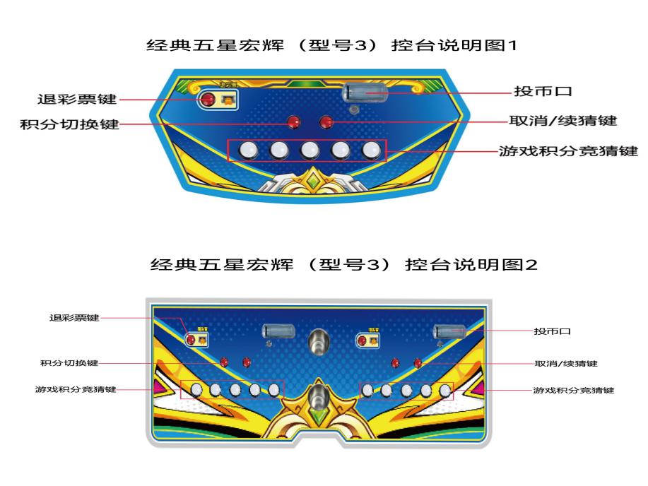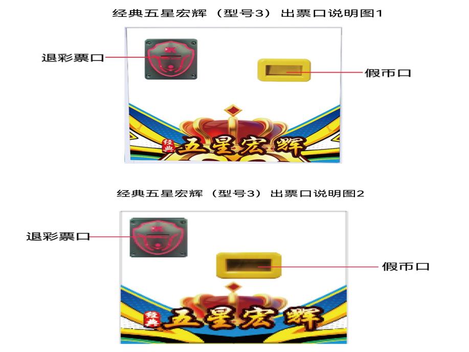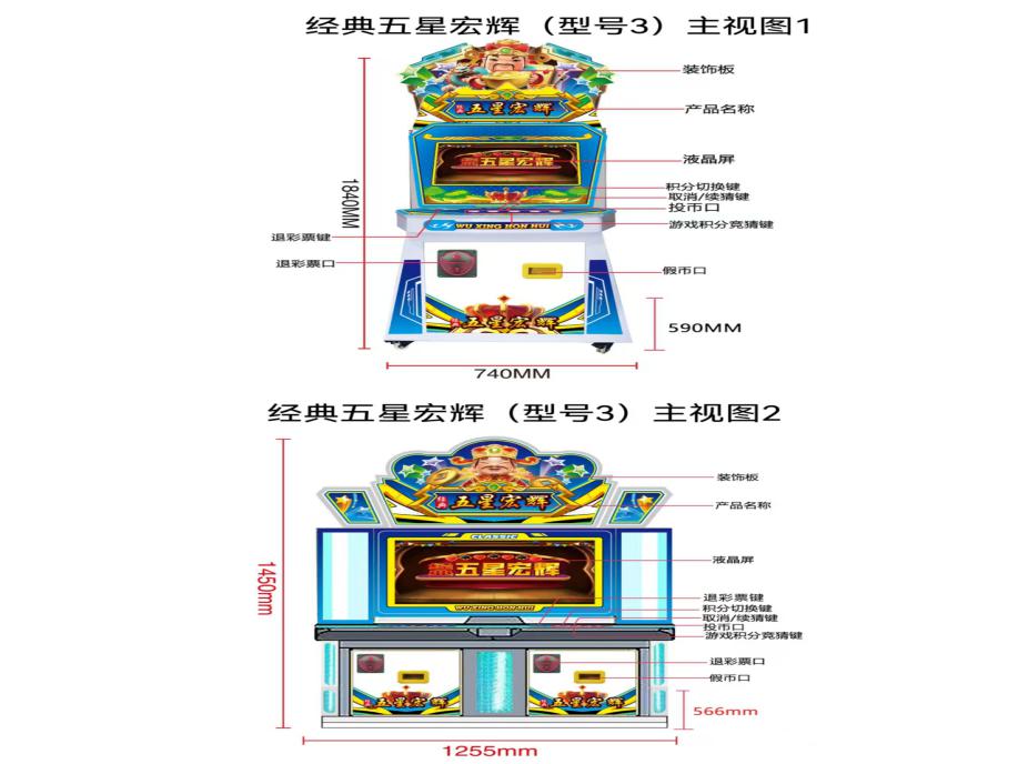 游戏内容简介 | 典五星宏辉(型号3)是为大众娱乐而设计的一款娱乐游戏游艺彩票机。本机支持合法合规的管理系统,也可通过打开微信或支付宝扫一扫管理系统卡头二维码/屏幕二维码/实体二维码扫码支付投币或投入实体游戏代币等方式获得对应的电子竞猜积分后玩家即可开始游戏/或等待机器自动倒计时。本机适用于网咖、竞技馆、动漫城、商超、台球俱乐部等符合经营许可的使用场所。本游戏以全新的玩法,简单明了的画面,给大家体验一个全新的竞猜类游戏。本机同时支持单台或者多台设备联机游玩。游戏里分别有四个颜色分别是:黑色黑桃,红色红桃,黑色梅花,红色方块以及金色皇冠(不同的颜色上面带有不同的数字或图案)。游戏开始前,屏幕左边蓝色纸张覆盖,屏幕右边是玩家历史竞猜中奖颜色的次数以及皇冠中奖的次数。游戏开始前,玩家可以给自己喜欢的颜色以及金色皇冠进行电子积分竞猜注入。游戏开始后,液晶屏幕左边蓝色纸张缓慢打开,将出现本局中奖颜色,则本局游戏结束(同时中奖颜色显示在屏幕右边)。当蓝色纸张打开出现的颜色或皇冠同时是游戏开始前玩家电子积分竞猜注入的颜色或皇冠,则获得该颜色或者皇冠相对应的电子积分/彩票奖励。玩家注入的电子竞猜积分不同,获得该颜色或皇冠相对应的电子积分/彩票奖励也就不同。游戏结束后,玩家可用获得的积分奖励手动选择退实物彩票/电子彩票,到店面吧台用实物彩票/电子彩票兑换精美礼品。玩家也可以选择退电子彩票直接返还到玩家手机上,也可以用手机扫卡头/屏幕二维码领取电子彩票,都可以链接到电子商城上选择心仪的礼品使用电子彩票兑换,填写正确的收货地址,商城将礼品通过快递送达。同时为了“顺应“互联网+”发展趋势,鼓励娱乐场所与互联网结合发展,实现场内场外、线上线下互动,增强娱乐场所体验式服务”的要求,本设备可以通过物联网技术把实体游戏游艺设备的游戏内容推送到移动端供客人游玩,仅限于从实体设备所在的公众号、小程序、APP及网络推广平台入口进入的玩家游玩。 | ||