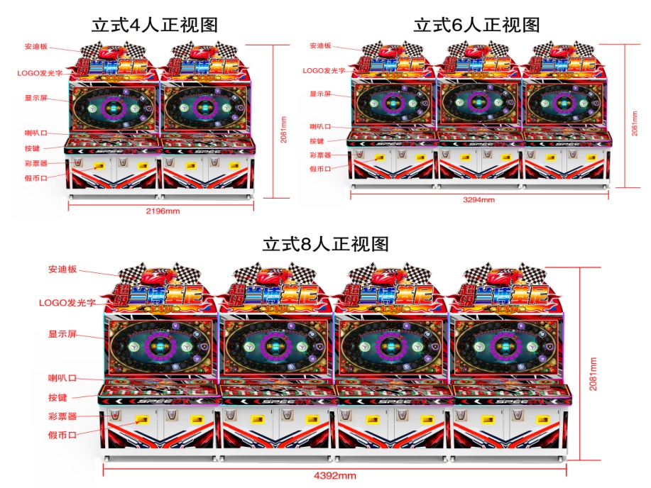 游戏内容简介 | 《超级兰博基尼至尊版(立式4/6/8人)》是为大众娱乐而设计的一款多人玩的娱乐游戏游艺彩票机。本机支持合法合规的管理系统,也可通过打开微信或支付宝扫一扫管理系统卡头二维码/屏幕二维码/实体二维码扫码支付投币或投入实体游戏代币等方式获得对应的游戏内游戏分数后玩家即可开始游戏/或等待机器自动倒计时。本机适用于网咖、竞技馆、动漫城、商超、台球俱乐部等符合经营许可的使用场所。本游戏以全新的玩法,丰富的卡通角色,游戏中每一个角色都拥有不同的效果技能,给大家体验一个全新的竞猜类游戏。游戏里有5台赛车分别是:变异奔驰(红、绿、黄),变异宝马(红、绿、黄),变异奥迪(红、绿、黄),变异大众(红、绿、黄),兰博基尼。所有的赛车依次以椭圆形序列在屏幕内展现出来。游戏开始前,玩家可以给自己喜欢的车辆、车辆的颜色进行游戏分数竞猜注入,游戏开始后,液晶屏幕中央出现椭圆形白色跑灯转盘指示灯(机器随机赠送的兰博基尼小游戏显示在椭圆型转盘内,小游戏分别有:1、大三元:红绿黄三个奔驰或宝马中奖; 2、小三元:红绿黄三个奥迪或大众中奖;3、清一色:同一颜色的4种车标中奖;4、彩金:按本局中奖灯位的押分比例送彩金;5、纵横四海:相连的两种车标六个灯中奖;6、九莲宝灯:相连的9个灯中奖;7、开火车:相连的4-12个灯中奖;8、通通有奖:所有押分乘以2-9倍;9、大满贯:24个灯全部中奖; 10、红色同中:红色的4种车标中奖;11、绿色同中:绿色的4种车标中奖; 12、黄色同中:黄色的4种车标中奖;13、奔驰同中:所有奔驰全部中奖; 14、宝马同中:所有宝马全部中奖;15、奥迪同中:所有奥迪全部中奖; 16、大众同中:所有大众全部中奖;),所有的赛车依次显示在椭圆形转盘内,然后圆形白色跑灯转盘指示灯开始启动,在画面内进行快速旋转转圈然后缓慢停止,当圆形白色跑灯转盘指示灯随机完全停止在某一辆赛车以及赛车的颜色时,则本局游戏结束。当玩家竞猜到圆形白色跑灯转盘指示灯完全停留在任意的某一辆赛车,则获得该车辆以及车辆的颜色相对应的电子彩票/彩票。玩家注入的游戏分数不同,获得该车辆以及车辆的颜色相对应的电子彩票/彩票也就不同。游戏结束后,玩家可用获得的游戏分数手动选择退实物彩票/电子彩票/礼品积分卡,可到店面吧台用彩票/电子彩票/礼品积分卡兑换精美礼品,也可以链接到电子商城上选择心仪的礼品使用彩票/电子彩票/彩票/礼品积分卡兑换,填写正确的收货地址,商城将精美礼品通过快递送达。同时为了“顺应“互联网+”发展趋势,鼓励娱乐场所与互联网结合发展,实现场内场外、线上线下互动,增强娱乐场所体验式服务”的要求,本设备可以通过物联网技术把实体游戏游艺设备的游戏内容推送到移动端供客人游玩,仅限于从实体设备所在的公众号、小程序、APP及网络推广平台入口进入的玩家游玩。 | ||