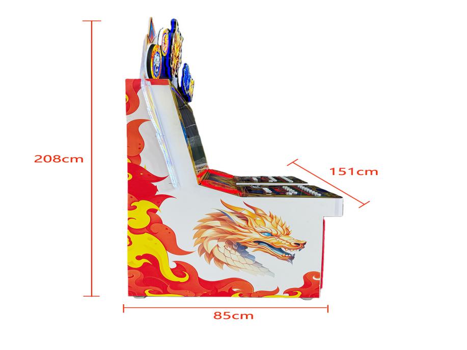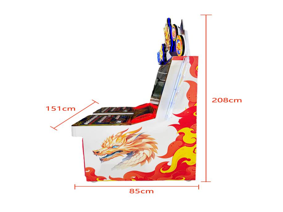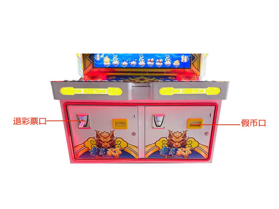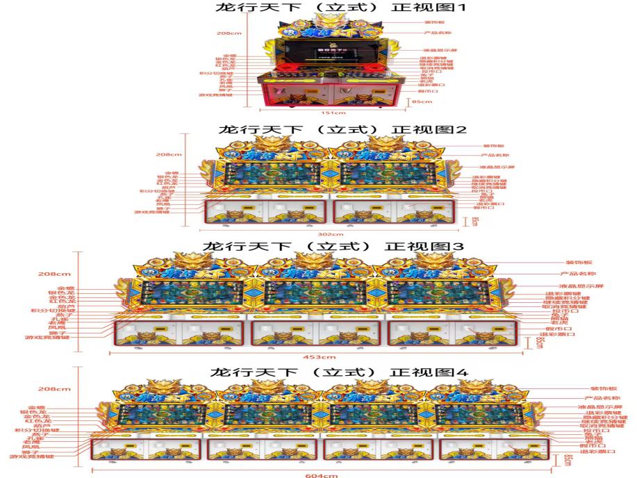 游戏内容简介 | 《龙行天下(立式)》是为大众娱乐而设计的一款竞猜型游戏游艺彩票机,本机支持合法合规的管理系统,也可通过打开微信或支付宝扫一扫管理系统卡头二维码/屏幕二维码/实体二维码扫码支付投币或投入实体游戏代币获得对应的电子竞猜积分后玩家即可开始游戏。本机适用于网咖、竞技馆、动漫城、商超、台球俱乐部等符合经营许可的使用场所。本游戏以简单的玩法,搭配卡通的角色(有飞禽类的动物、走兽类的动物以及龙、葫芦、金蟾),游戏中每一个角色都拥有不同的效果技能,给大家体验一个简单炫酷好玩的竞猜类游戏。同时本机支持立式二人/四人/六人/八人联机游玩。游戏里分别有八只不同种类的动物(分别是草原之王狮子、森林之王老虎、国宝熊猫、大耳朵兔子、孔雀皇后、空中霸主老鹰、勤劳的燕子、神话凤凰以及三条颜色不同的龙(红色、金色、银色)以及葫芦、金蟾。龙/葫芦/金蟾/飞禽走兽动物们依次以长方形序列在液晶屏幕内展现出来(同时屏幕内会把一部分历史游戏竞猜结果展示出来供游戏玩家参考)。游戏开始前,玩家给自己喜欢的飞禽类动物/走兽类动物/龙/葫芦/金蟾进行积分竞猜注入,游戏开始后,屏幕内中央绿色神龙口吐白色光条在所有角色内进行快速旋转转圈然后缓慢停止,当屏幕内中央绿色神龙口吐白色光条完全停留在任意一只动物/龙/葫芦/金蟾时,则本局游戏结束。当玩家在游戏开始前竞猜的任意一只动物/龙/葫芦/金蟾同时是屏幕内中央绿色神龙口吐白色光条转圈最后完全停留下来的动物/龙/葫芦/金蟾时,则获得该动物/龙/葫芦/金蟾相对应的电子积分/彩票奖励。玩家注入的电子竞猜积分不同,获得该动物/龙/葫芦/金蟾相对应的电子积分/彩票奖励也就不同。玩家可用获得的积分奖励手动选择退实物彩票/电子彩票,到店面吧台用实物彩票/电子彩票兑换精美礼品。玩家也可以选择退电子彩票直接返还到玩家手机上,也可以用手机扫卡头/屏幕二维码领取电子彩票,都可以链接到电子商城上选择心仪的礼品使用电子彩票兑换。同时为了“顺应“互联网+”发展趋势,鼓励娱乐场所与互联网结合发展,实现场内场外、线上线下互动,增强娱乐场所体验式服务”的要求,本设备可以通过物联网技术把实体游戏游艺设备的游戏内容推送到移动端供客人游玩,仅限于从实体设备所在的公众号、小程序、APP及网络推广平台入口进入的玩家游玩。 | ||