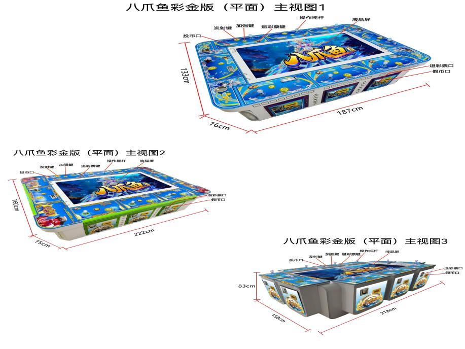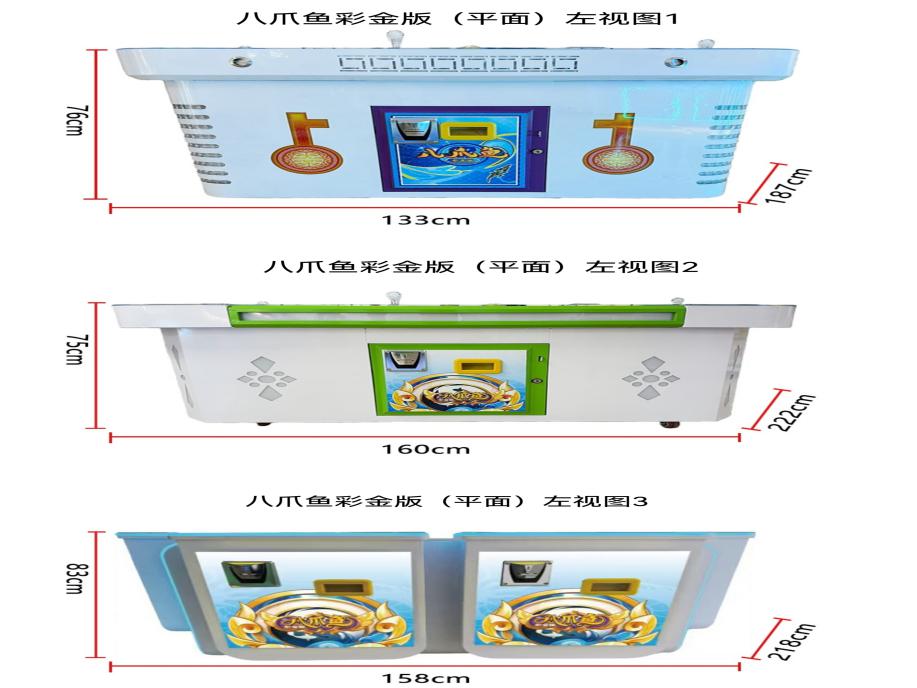 游戏内容简介 | 《八爪鱼彩金版(平面)》是为大众娱乐而设计的一款游戏游艺彩票机,本机支持合法合规的管理系统,也可通过打开微信或支付宝扫一扫管理系统卡头二维码/屏幕二维码/实体二维码扫码支付投币或投入实体游戏代币获得对应的电子积分子弹数后玩家即可手动启动游戏。本机适用于网咖、竞技馆、动漫城、商超、台球俱乐部等符合经营许可的使用场所。本游戏以海洋生物+异兽+道具为游戏题材。(比如:虾虎鱼、暹罗斗鱼、鳉鱼、气泡鱼、狮子鱼、斑斓鱼、刺豚鱼、蓝吊鱼、灯笼鱼、乌龟、吊尾鱼、蝴蝶鱼、马尾鱼、先锋鱼、魔鬼鱼、银鲨、金鲨、红金龙鱼集满五个送彩金、胖头鲨、黄老虎、红老虎、莲花同生共死、螃蟹连环炸弹、螃蟹钻头炮、螃蟹激光炮、随机送JP大奖天降财神彩金、双龙刀一击必杀、财神送九尾狐捕鱼、财神送砸金蛋、财神送渔翁捕鱼、财神送龙卷风、财神送饷鼓开心30秒、财神送金船出海、财神送金色色盅、财神送仙女全屏炸弹、火麒麟觉醒、神龙、金色大象送彩金、蓝珠定屏炸弹、火龙珠局部炸弹、铠甲鳄鱼、金牛、孙悟空全屏炸弹、魔女全屏炸弹、各类型鱼类组合鱼、闪电连锁等等)。由多种不同风格的场景,众多各具特色的海洋生物/异兽/道具身上蕴藏着无尽的秘密,等待着勇敢的玩家深入探索,体验一场视觉盛宴。在射击过程中击杀孙悟空全屏炸弹、魔女全屏炸弹可以获得超级大奖,让玩家获得丰厚的电子积分/彩票奖励。同时在游戏中,玩家在射击任意海洋生物/异兽/道具时,会消耗电子积分子弹数,击杀任何的海洋生物/异兽/道具都会得到该海洋生物/异兽/道具相对应的电子积分/彩票奖励,当玩家电子积分子弹数为零时则游戏结束。玩家可用获得的积分奖励手动选择退实物彩票/电子彩票,到店面吧台用实物彩票/电子彩票兑换精美礼品。玩家也可以选择退电子彩票直接返还到玩家手机上,也可以用手机扫卡头/屏幕二维码领取电子彩票,都可以链接到电子商城上选择心仪的礼品使用电子彩票兑换。同时为了“顺应“互联网+”发展趋势,鼓励娱乐场所与互联网结合发展,实现场内场外、线上线下互动,增强娱乐场所体验式服务”的要求,本设备可以通过物联网技术把实体游戏游艺设备的游戏内容推送到移动端供客人游玩,仅限于从实体设备所在的公众号、小程序、APP及网络推广平台入口进入的玩家游玩。 | ||