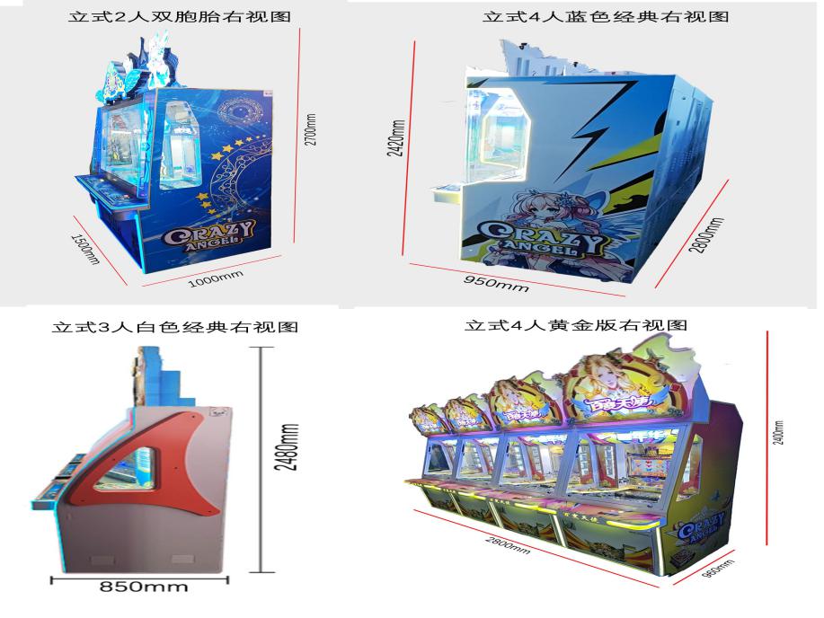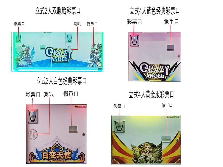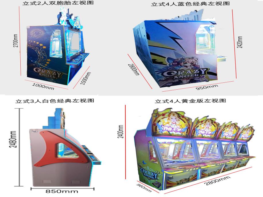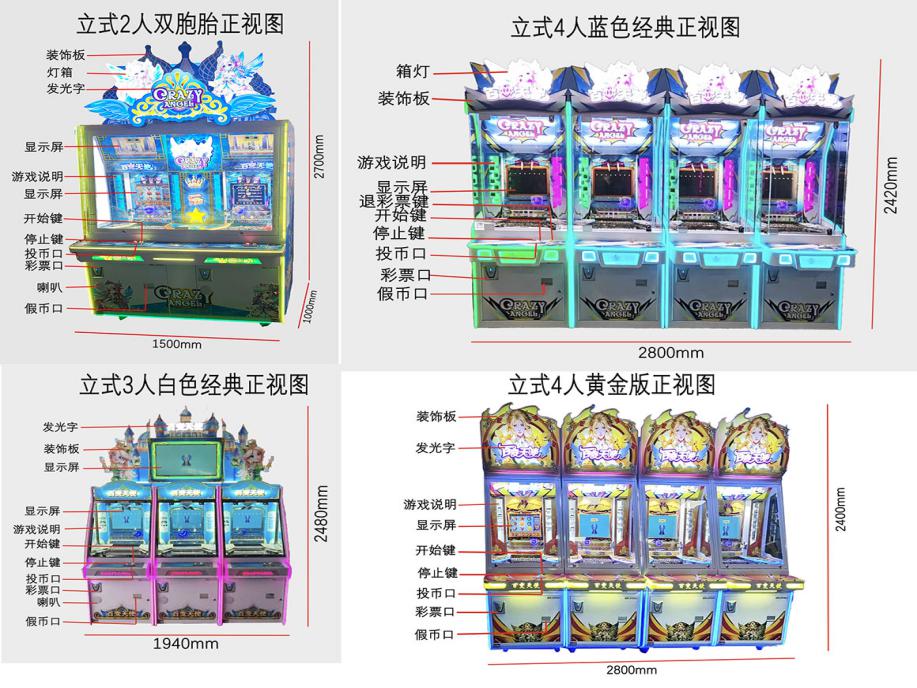 游戏内容简介 | 《百变天使(立式)》是为大众娱乐而设计的一款支持以推推乐为主题的推币类游戏游艺娱乐设备(本机有立式2人双胞胎,立式3人白色经典,立式4人蓝色经典,立式4人黄金版四种样式,可以无限联机游玩)。本机支持合法合规的管理系统,也可通过打开微信或支付宝扫一扫管理系统卡头二维码/屏幕二维码/实体二维码扫码支付投币或投入实体游戏代币后玩家即可开始游戏。本机适用于网咖、竞技馆、动漫城、商超、台球俱乐部等符合经营许可的使用场所。这款游艺设备结合融入了很卡通人物及物品角色及经典道具;如:弓箭,粉钻,皇冠,玫瑰,太阳笑脸,天使,天使装备卡,医药箱,卡通手枪,卡通锤,宝箱等。这些道具不仅仅是物品,更是在天使童话中展现魅力,创造奇迹的重要工具,他们共同构成了一个充满魅力和神秘的天使世界。让游戏玩家仿佛置身于这个神秘的天使童话世界之中,玩家通过投入游戏代币的时间和雨刷器左右摆动的频率,来控制游戏代币从机器最顶端掉落到堆盘的时间节点,并判断游戏代币掉落到左右移动的幸运通道口的机会。当游戏代币落入幸运通道,则启动屏幕小游戏:竖线奖,横线奖,开心30秒,激情时刻,争分夺秒,狂热派对,获得游戏的额外奖励,获得更多从机器最顶端掉代币奖励到堆盘;将获得更多从机器最顶端的落币奖励到堆盘;如果游戏代币直接掉落到堆盘时,则堆盘推动游戏代币前进和叠加,当游戏代币滑落堆盘时,玩家可获得彩票奖励。同时玩家可用获得的彩票奖励手动选择退实物彩票/电子彩票,可到店面吧台用彩票/电子彩票兑换精美礼品。也可以链接到电子商城上选择心仪的礼品使用彩票/电子彩票兑换,填写正确的收货地址,商城将精美礼品通过快递送达。同时为了顺应“互联网+”发展趋势,鼓励娱乐场所与互联网结合发展,实现场内场外、线上线下互动,增强娱乐场所体验式服务”的要求,本设备可以通过物联网技术把实体游戏游艺设备的游戏内容推送到移动端供客人游玩,仅限于从实体设备所在的公众号、小程序、APP及网络推广平台入口进入的玩家游玩。 | ||