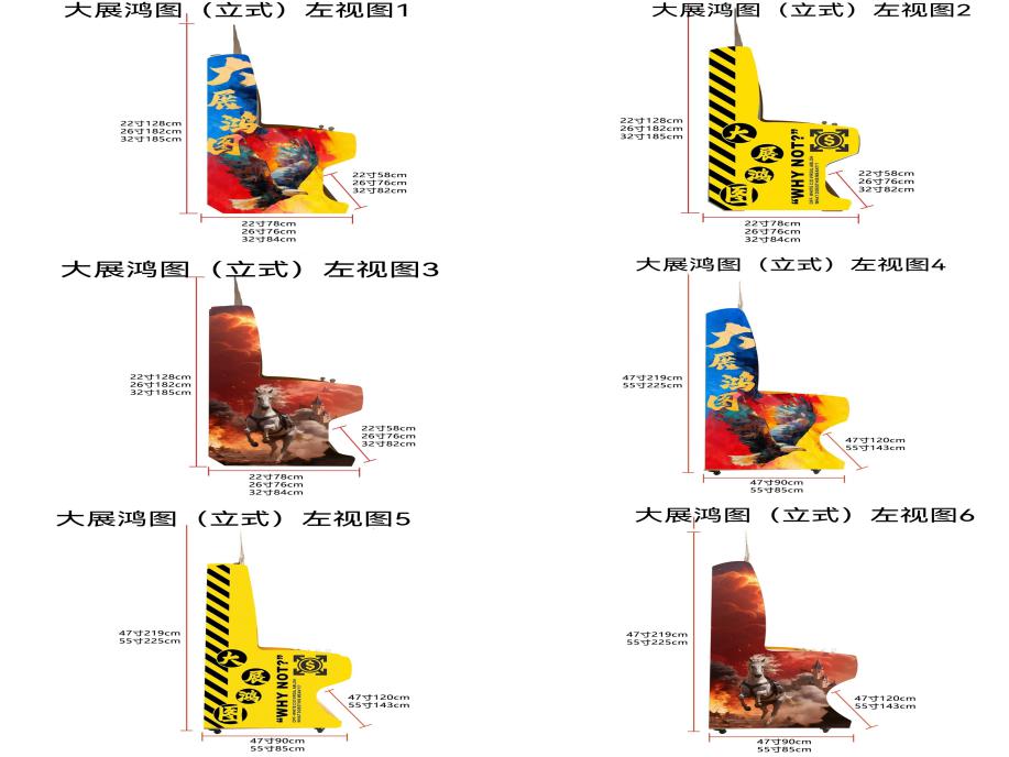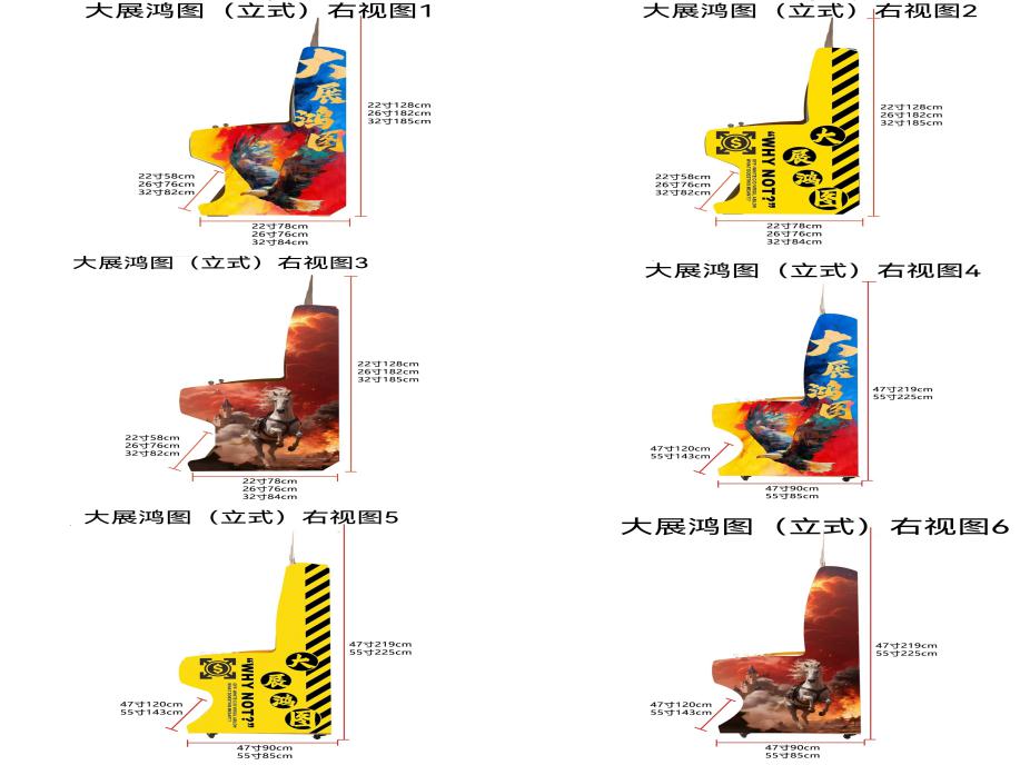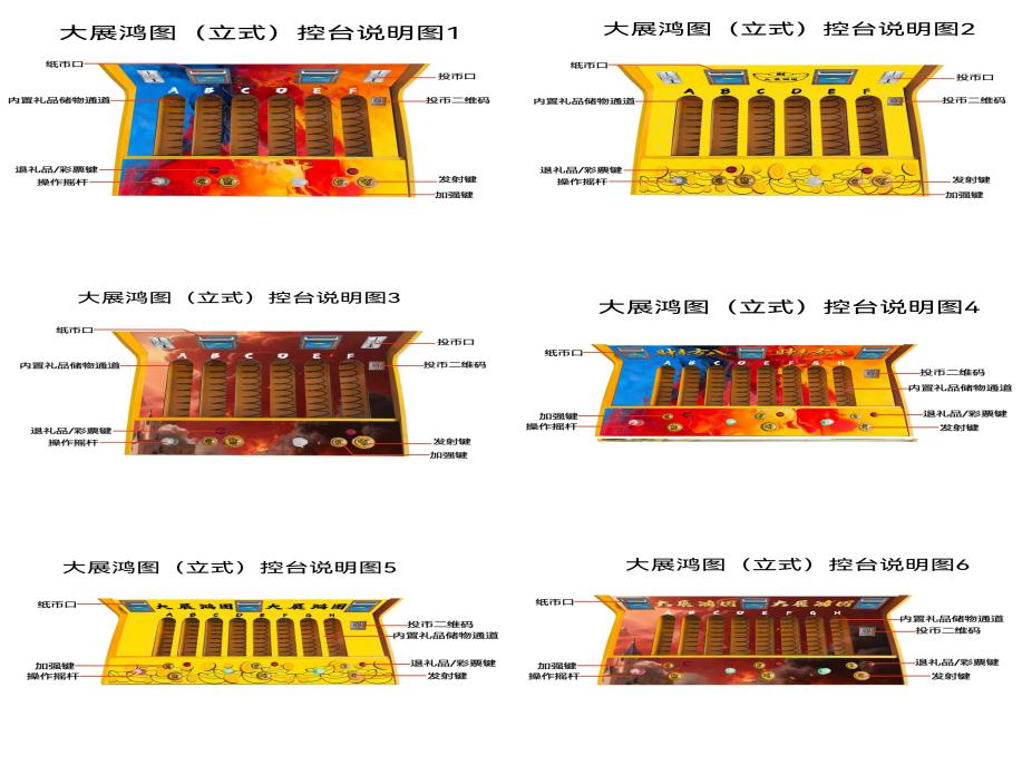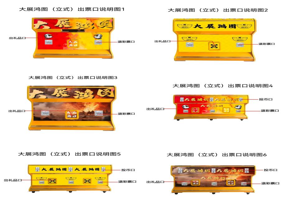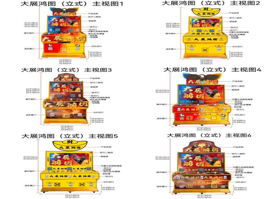 游戏内容简介 | 《大展鸿图(立式)》是为大众娱乐而设计的一款游戏游艺彩票/礼品机,本机支持合法合规的管理系统,也可通过打开微信或支付宝扫一扫管理系统卡头二维码/屏幕二维码/实体二维码扫码支付投币或投入实体游戏代币获得对应的电子积分子弹数后玩家即可手动启动游戏。本机适用于网咖、竞技馆、动漫城、商超、台球俱乐部等符合经营许可的使用场所。本游戏可选以海洋生物+异兽+道具为游戏题材,可选虫类生物+异兽+道具为游戏题材,可选鸟类生物+异兽+道具为游戏题材。(比如鱼类题材一:虾虎鱼、暹罗斗鱼、气泡鱼、狮子鱼、斑斓鱼、刺豚鱼、蓝吊鱼、乌龟、吊尾鱼、蝴蝶鱼、马尾鱼、海藻、魔鬼鱼、金鲨、银鲨、蝙蝠、招财猫开心拍拍乐30秒、关羽全屏炸弹、吕布全屏炸弹、张飞全屏炸弹、剑仙、老虎、凤凰、狮子、神龙、大象、麒麟、礼品美人鱼、一箭双雕礼品美人鱼、连中三元礼品美人鱼、各类型鱼类组合等等。鱼类题材二:黄鱼、绿鱼、紫鱼、红鱼、灯笼鱼、大头鱼、电鳗、海龟、蓝鲨、先锋鱼、魔鬼鱼、金鲨、老鹰集满五个送彩金、红色神牛、美人鱼、仙鹤送彩金、黑色神牛、神龙、豹子、麒麟、凤凰、狮子、大象、老鹰全屏炸弹、老虎全屏炸弹、随机送JP大奖天降财神彩金、金色神牛送福彩金、分天火箭一击必杀、莲花台送无敌炸弹、莲花台送幸运宝箱、莲花台送幸运转盘、莲花台送开心30秒、莲花台送幸运色盅、红色组合鱼、各类型鱼类组合鱼等等。虫类题材:蝴蝶、独角仙、飞蛾、棕蝴蝶、红蝴蝶、七星瓢虫、锹甲、蜜蜂、红蝽、大黄蜂、大型甲虫、胡蜂、蓝蝇、犀金龟、金钳甲虫、绿蝇、白蝇、青蝇、各类型昆虫、礼品美人鱼、异兽、道具等等。鸟类题材:燕子、蝙蝠、鸽子、黄鹂鸟、猫头鹰、大雁、天鹅、鹦鹉、巨嘴鸟、火烈鸟、鹈鹕、变种孔雀鸡、蓝孔雀、猛禽老鹰、红凤凰、金凤凰、金色金雕、鸵鸟、变异神鹰全屏炸弹、猴子宝宝集满五个送彩金、宝鼎送幸运般子、豹子局部炸弹、蓝色飞鹤定屏炸弹、七彩凤凰随机奖励翻倍、仙鹤、金色大象送财运到彩金、螃蟹电磁炮、螃蟹连环炸弹、螃蟹钻头炮、凤凰礼品、飞天白马全中礼品、凤凰礼品组合、黑龙、凤凰彩金、金圈同类炸弹、随机小草、红鱼组合鸟、各类型组合鸟、金色摇钱树送超级大奖、随机送JP大奖天降财神彩金等等)。由多种不同风格的场景,众多各具特色的海洋生物/虫类生物/鸟类生物/异兽/道具身上蕴藏着无尽的秘密,等待着勇敢的玩家深入探索,体验一场视觉盛宴。在射击过程中击杀老鹰全屏炸弹、老虎全屏炸弹可以获得超级大奖,让玩家获得丰厚的电子积分/彩票奖励。本设备同时支持多台联机游玩,支持单机立式四人台(四十七寸以及五十五液晶显示),设备亚克力头顶可拆卸。同时在游戏中,玩家在射击任意海洋生物/怪物生物/鸟类生物/异兽/道具时,会消耗电子积分子弹数,击杀任何的海洋生物/虫类生物/鸟类生物/异兽/道具都会得到该海洋生物/虫类生物/鸟类生物/异兽/道具相对应的电子积分/彩票奖励,当玩家电子积分子弹数为零时则游戏结束。玩家可用获得的积分奖励手动选择退实物彩票/电子彩票/礼品/礼品卡,到店面吧台用实物彩票/电子彩票/礼品卡兑换精美礼品。玩家也可以选择退电子彩票直接返还到玩家手机上,也可以用手机扫卡头/屏幕二维码领取电子彩票,都可以链接到电子商城上选择心仪的礼品使用电子彩票/礼品卡兑换。同时为了“顺应“互联网+”发展趋势,鼓励娱乐场所与互联网结合发展,实现场内场外、线上线下互动,增强娱乐场所体验式服务”的要求,本设备可以通过物联网技术把实体游戏游艺设备的游戏内容推送到移动端供客人游玩,仅限于从实体设备所在的公众号、小程序、APP及网络推广平台入口进入的玩家游玩。 | ||