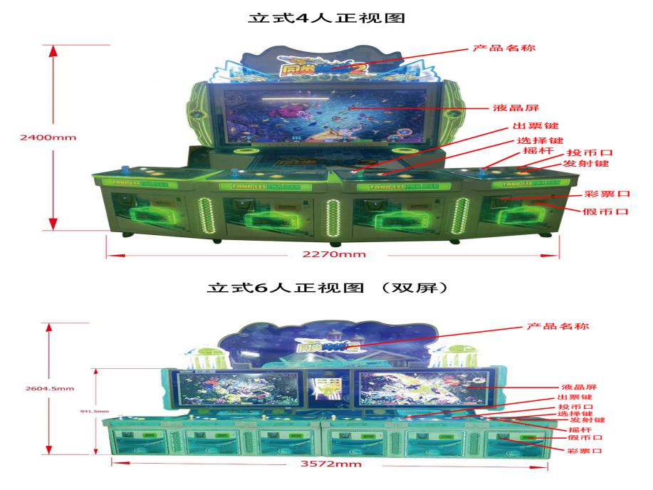 游戏内容简介 | 《同类炸弹Ⅱ(立式4/6人)》是为大众娱乐而设计的一款射击类游戏游艺彩票/礼品机,本机支持合法合规的管理系统。也可通过打开微信或支付宝扫一扫管理系统卡头二维码/屏幕二维码/实体二维码扫码支付投币或投入实体游戏代币获得对应的游戏分数和子弹数后玩家即可手动启动游戏。本机适用于网咖、竞技馆、动漫城、商超、台球俱乐部等符合经营许可的使用场所。该设备是一款集海洋鱼类,天空飞鸟,两大主题的模拟射击类游戏。玩家在游戏中作为猎人的角色,可射击到多种海洋鱼类,(比如:小眼鱼、大眼鱼、蝴蝶鱼、金鲨、白鲨、斑斓鱼、刺猬鱼、乌龟、小鲨鱼、灯笼鱼、金雕鱼、斑斓鲨、魔鬼鱼、小鱼群、深水鳄鱼、鸟、青龙、白龙、金龙、开心30秒、超级大奖、随机宝箱、万箭齐发、一击必杀、全屏炸弹、钻头炮、连环炸弹、电磁炮、局部炸弹、定屏炸弹、同类炸弹、随机、一箭双雕、大三元、大四喜、天降财神、金蟾)等等,海底的各种奇幻世界。除了让你感受绚丽多彩,缤纷有趣的海底世界外,还能享受到捕获鱼儿的惊喜。本游戏画面逼真、新奇,游戏操作简单、直观。玩家通过遥杆及按键操控发射炮弹,收获射击鱼儿的趣味,打中目标获得相应的奖励,最终按照玩家捕获数量获得彩票。当以森林天空飞鸟为主题时,玩家犹如进入了鸟的天堂,沉浸在鸟语花香,与五彩缤纷的世界相融,(比如:火焰红鸟、紫色鸟、深蓝尖喙鸟、黄腹黑翅鸟 浅紫鸟、蓝色鸟、棕黄色鸟、灰褐色鸟、金黄色火箭尾鸟、深紫黄嘴鸟、红色长颈鸟、绿翅红嘴鸟、蓝身红冠鸟、金红凤凰状鸟、蓝绿孔雀状鸟、棕白头鹰 凤凰、神鸟、金翅大鹏、粉红仙鹤、深蓝巨鹰、孙悟空、金色宝鼎、幸运骰子 局部炸弹、定屏炸弹、随机翻倍、奖励、发光仙鹤、财运到彩金、电磁炮、连环炸弹、钻头炮、单个礼品、全中礼品、一箭双雕礼品组合、连中三元礼品组合、同类炸弹、随机、开心30秒、红鱼组合、大三元、大四喜、超级大奖、天降财神)等充满趣味和益智性适合各个年龄段的玩家,在整个冲关过程中锻炼了玩家的手眼协调性和提高玩家注意力。每一关卡都会给玩家带来了不一样的体验。游戏结束后,玩家可用获得的实物彩票/电子彩票,可到店面吧台用彩票/电子彩票兑换精美礼品。玩家也可以选择退电子彩票直接返还到玩家手机上,也可以用手机扫卡头/屏幕二维码领取电子彩票,都可以链接到电子商城上选择心仪的礼品使用电子彩票/礼品卡兑换,填写正确的收货地址,商城将礼品通过快递送达。同时为了“顺应“互联网+”发展趋势,鼓励娱乐场所与互联网结合发展,实现场内场外、线上线下互动,增强娱乐场所体验式服务”的要求,本设备可以通过物联网技术把实体游戏游艺设备的游戏内容推送到移动端供客人游玩,仅限于从实体设备所在的公众号、小程序、APP 及网络推广平台入口进入的玩家游玩。 | ||