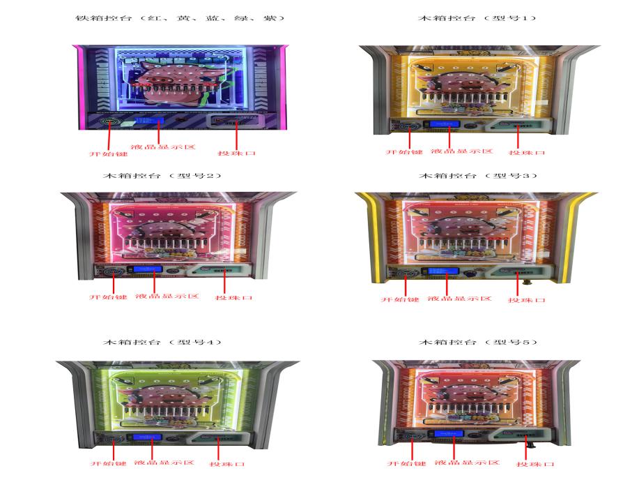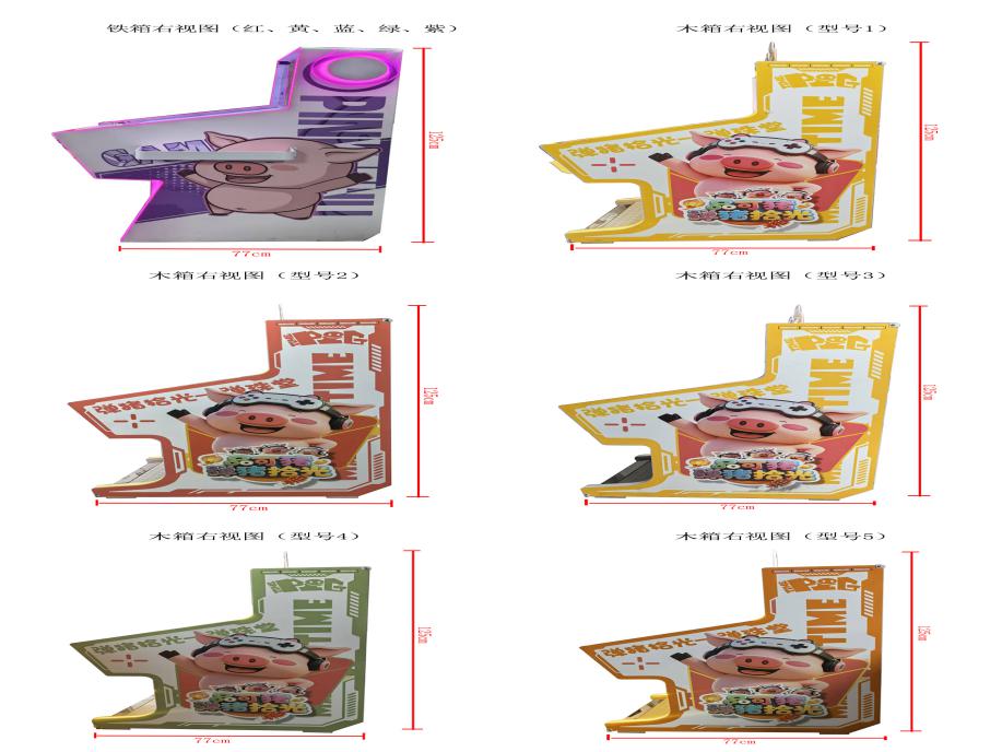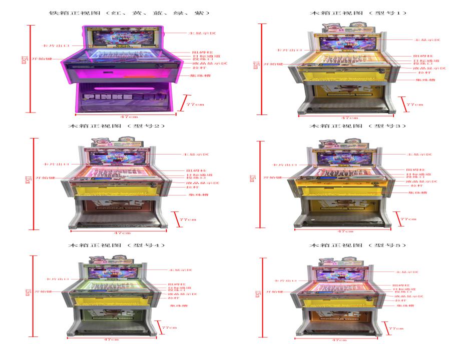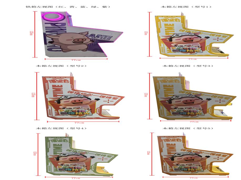 游戏内容简介 | 《弹猪拾光(立式)》是我公司专为大众娱乐而自主设计研发的一款弹珠竞技游戏,是一款趣味性很强的弹球竞技性互动游戏设备,本设备外观集合潮玩元素设计,有红、黄、蓝、绿、紫等多款颜色设计,采用木板、亚克力和五金等材料完美结合。本机适用于动漫城、超市、商超、台球俱乐部、电影院等符合经营许可的使用场所。该机台支持合法合规的管理系统,可扫描二维码打开微信或支付宝扫一扫乐园管理系统二维码或屏幕二维码,选择支付套餐,进行支付购买陶瓷珠/玻璃珠/游戏币等,购买完陶瓷珠/玻璃珠/游戏币之后可以开始游戏,通过复刻传统儿童玻璃弹珠机玩法,结合潮流场景与趣味机关设计,唤醒家长与孩子对童年的美好记忆。设备通过玩家控制力道拉动拉杆,弹出小球,经过各种障碍物后进入亮灯通道,从而获得不同数量的各种潮玩卡片,通过手眼协调操作锻炼玩家的专注力与控制力,打造兼具趣味性、教育性与健康价值的娱乐体验。游戏有一条发射通道,多条奖励通道,奖励玩家获得相应的塑料珠,加上各种由亚克力、铁钉和胶圈制作的障碍物。游戏开始后,小球需要经过发射通道,再经过各种障碍物,再进入到其中一个奖励通道中。不同的通道,对应的奖励卡片数量不同。按开始键开始游戏,按完开始键后奖励通道上的灯会随机亮起,玩家这时要判定自己的力度,分析小球可能会经过哪些障碍,最终到达想到去到的通道中。分析结束,玩家可以拉动弹簧装置来让小球从发射通道发射出去,小球会在经过各种障碍后,随机进入某个奖励通道,若该通道灯亮,则中奖,玩家打中亮灯通道获得相应的卡片,彩票,塑料珠等。如该通道灯不亮,则未中奖。未中奖,则小球再次回到起点,玩家可以重新进入下一轮游戏,如中奖,则设备根据中奖通道不同给出相应不同的奖励。左侧卡片出口会自动推出相应的奖励卡片等。奖励的潮玩卡片玩家可以自己带回家收集,也可兑换成积分,到店里选择心仪的礼品,使用积分兑换。游戏让玩家既获得体验感,又能锻炼玩家的分析判断的能力,力量的控制能力,音乐生动有趣,玩法简单,深受各个年龄段玩家朋友喜爱。 | ||