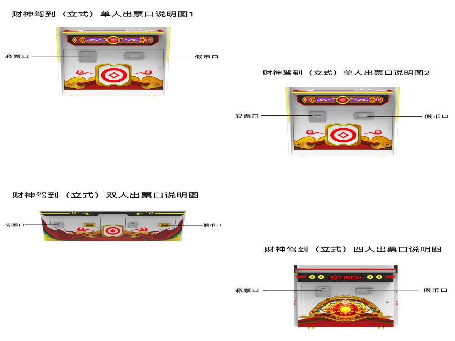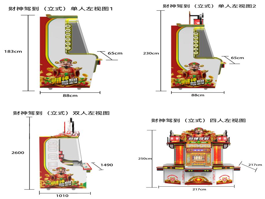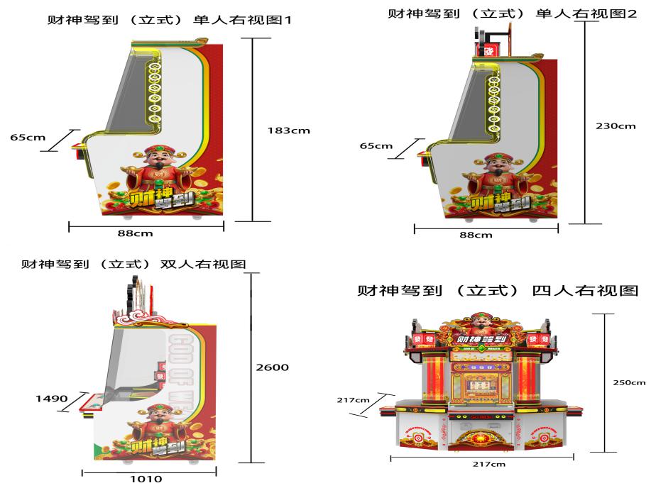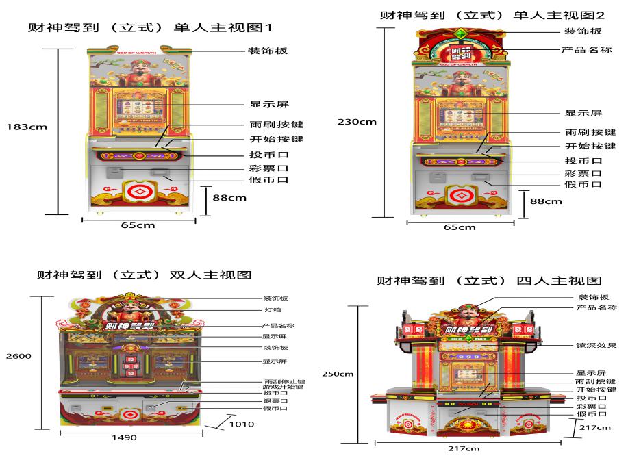 游戏内容简介 | 《财神驾到(立式)》是为大众娱乐而设计的一款支持以推推乐为主题的推币类游戏游艺娱乐设备(本机支持立式单人/双人/三人/四人/五人台、圆形四人、双人联体、以及无限联机游玩)。本机支持合法合规的管理系统,也可通过打开微信或支付宝扫一扫管理系统卡头二维码/屏幕二维码/实体二维码扫码支付投币或投入实体游戏代币后玩家即可开始游戏。本机适用于网咖、竞技馆、动漫城、商超、台球俱乐部等符合经营许可的使用场所。这款游艺设备结合融入了很多财神主题人物及物品角色及经典道具;如:红包、如意、钱袋财神、元宝、灯笼、钱串、聚宝盆、鼓、发字等。这些道具不仅仅是物品,更是在财神之路中展现魅力,创造奇迹的重要工具,他们共同构成了一个充满魅力和神秘的财神世界。让游戏玩家仿佛置身于这个神秘的财神之路世界之中,玩家通过投入游戏代币的时间和雨刷器左右摆动的频率,来控制游戏代币从机器最顶端掉落到堆盘的时间节点,并判断游戏代币掉落到左右移动的幸运通道口的机会。当游戏代币落入幸运通道,则启动屏幕小游戏,财神到、、恭喜发财、福星高照、一击即中、全盘奖、连线奖、JP1、JP2、JP3,获得游戏的额外奖励,获得更多从机器最顶端和两侧掉入代币奖励到堆盘;将获得更多从机器最顶端的落币奖励到堆盘;如果游戏代币直接掉落到堆盘时,则推盘推动游戏代币前进和叠加,当游戏代币滑落堆盘时,玩家可获得彩票奖励。同时玩家可用获得的彩票奖励手动选择退实物彩票/电子彩票,可到店面吧台用彩票/电子彩票兑换精美礼品。也可以链接到电子商城上选择心仪的礼品使用彩票/电子彩票兑换,填写正确的收货地址,商城将精美礼品通过快递送达。同时为了顺应“互联网+”发展趋势,鼓励娱乐场所与互联网结合发展,实现场内场外、线上线下互动,增强娱乐场所体验式服务”的要求,本设备可以通过物联网技术把实体游戏游艺设备的游戏内容推送到移动端供客人游玩,仅限于从实体设备所在的公众号、小程序、APP及网络推广平台入口进入的玩家游玩。 | ||