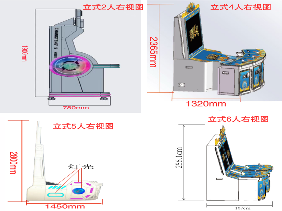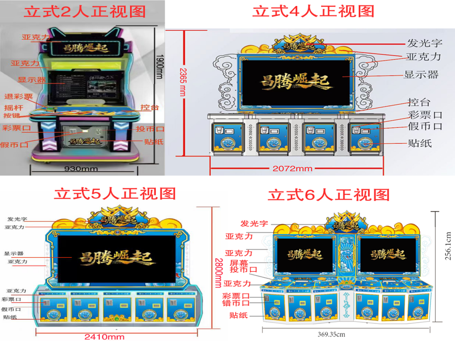 游戏内容简介 | 【昌腾崛起(立式)】是为大众娱乐而设计的娱乐游戏游艺设备,本机支持合法合规的管理系统,也可通过打开扫一扫管理系统二维码/屏幕二维码/实体二维码扫码支付投币或投入实体游戏代币获得对应的子弹数后玩家即可手动启动游戏。本机适用于网咖、竞技馆、动漫城、商超、台球俱乐部等符合经营许可的使用场所。该设备是一款集海洋鱼类,天空飞鸟,卡通昆虫,卡通怪兽,天空战机五大主题的模拟射击类游戏。玩家在游戏中作为猎人的角色,可射击到多种海洋鱼类,包括大迦鳅鱼、小丑鱼、河豚、狮子鱼、乌龟、旗鱼、灯笼鱼、锯齿鲨、组队鱼群,霸王龟,金色龙龟,深海鳄鱼等,鱼儿游过深海、圳瑚、海底的各种奇幻世界。除了让你感受绚丽多彩,缤纷有趣的海底世界外,还能享受到捕获鱼儿的惊喜。本游戏画面逼真、新奇,游戏操作简单、直观。玩家通过遥杆及按键操控发射炮弹,收获射击鱼儿的趣味,打中目标获得相应的奖励,最终按照玩家捕获数量获得彩票。游戏设备超高清晰液晶显示屏,无论是画面精致细腻程度,或者是颜色的协调,还是光影投射的效果,都逼真的近乎完美,加上美妙的音乐,令玩家爱不释手,欢乐无穷。在游戏的过程中,效果绚丽震撼,提供给玩家一个趣味十足的游乐世界,适合成人及亲子娱乐。当以森林天空猎鸟为主题时,玩家犹如进入了鸟的天堂,沉浸在鸟语花香,与五彩缤纷的世界相融,同类鸟,闪电鸟,充满趣味和益智性适合各个年龄段的玩家,在整个冲关过程中锻炼了玩家的手眼协调性和提高玩家注意力。当以卡通昆虫类爬行为主题时,里面包含了三幅场景,分别以枝繁叶茂的夏天,果实累累的秋天以及大雪纷飞的冬天三个场景,并以与三个季节相契合的绿色、黄色、蓝色为主色调的场景打造构成。同时每个场景里面以“可爱卡通”的风格体现了每个季节的虫类动物,以毛毛虫,蜘蛛,螳螂,蝎子,蜜蜂,蚂蚁,蜻蜓等小动物的游玩,突显动态有趣的效果。可通过拍打按键以及配合晃动摇杆的方式进行捕捉,以此来获取对应的彩票数量。游戏里面还有核心boss:蜈蚣 、蜘蛛、蝎子等拥有神奇的能力,击中后将会出现奖励翻倍的效果。游戏不仅充满了趣味性,而且可以锻炼玩家的反应能力和操作能力,每一关卡都会给玩家带来了不一样的体验。当以怪兽为主题时,游戏的地图丰富,游戏开始后多种兽王随机出现,游戏玩家火力集中击杀各种兽王以及boss后可获得相应的能量值,获得的能量可以继续攻击更多魔怪以及boss,游戏玩法生动有趣,在游戏中让玩家挑战自我极限,游戏中出现的妖怪以及boss.万倍轮盘,雷凤凰,火凤凰,雷神,巨型蛛,铁甲战士,天使蛋,地狱三头犬钻头磨,炸弹,闪电虎,狼骑斗士,冰原狼人,旋风怪,巨石人,连环炸弹,魔王随从等。玩家使用子弹,自由选择攻击当前屏幕上出现的妖怪以及boss,游戏过程中不定期的出现妖风清扫,来助力玩家消灭妖怪,击倒兽王,赠送威力强大的神奇武器,玩家既获得体验感,又能提高免疫力,又能获得通关的乐趣,玩家可以使用多种不同的子弹体验多种不同的设计效果。当以游天空战机为主题时,采用先进物理引擎与次世代画质,云层流动、昼夜交替、动态天气等细节拉满沉浸感——雷暴天会干扰雷达,雨天影响能见度,而云层既能隐蔽行踪也能成为伏击战场。从地球大气层到外星基地,丰富关卡设计涵盖消灭敌机、保卫友军、BOSS攻坚等多元目标,敌人将动态调整战术,每一场战斗都充满未知挑战。游戏结束后,玩家可用获得的实物彩票/电子彩票,可到店面吧台用彩票/电子彩票兑换精美礼品,电子彩票直接返还到玩家手机上或玩家用手机扫系统二维码/屏幕二维码领取相应奖励,获得实物彩票按经营方合规方式选择心仪的礼品使用(礼品需符合国家法律及当地政策的规定)。同时为了“顺应“互联网+”发展趋势,鼓励娱乐场所与互联网结合发展,实现场内场外、线上线下互动,增强娱乐场所体验式服务”的要求,本设备可以通过物联网技术把实体游戏游艺设备的游戏内容推送到移动端供客人游玩,仅限于从实体设备所在的公众号、小程序、APP及网络推广平台入口进入的玩家游玩。 | ||