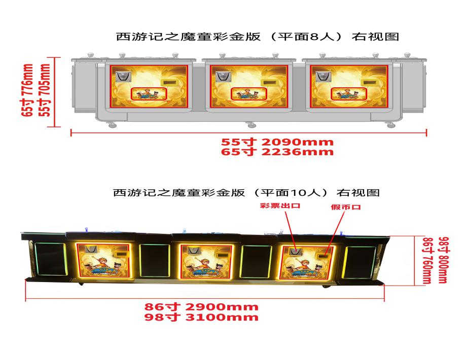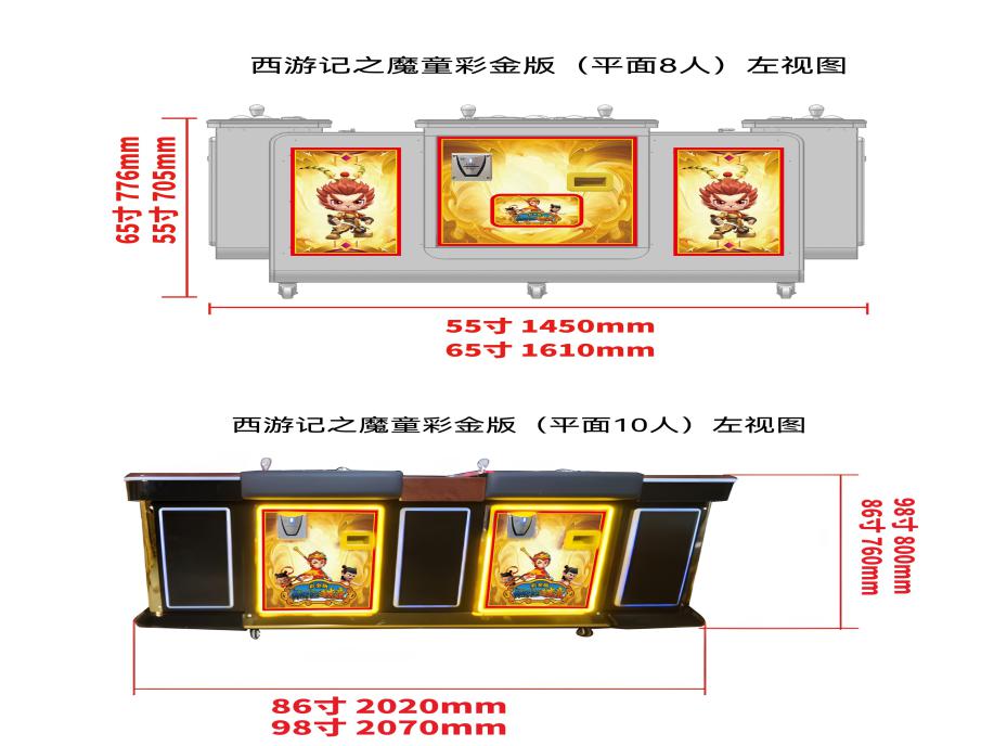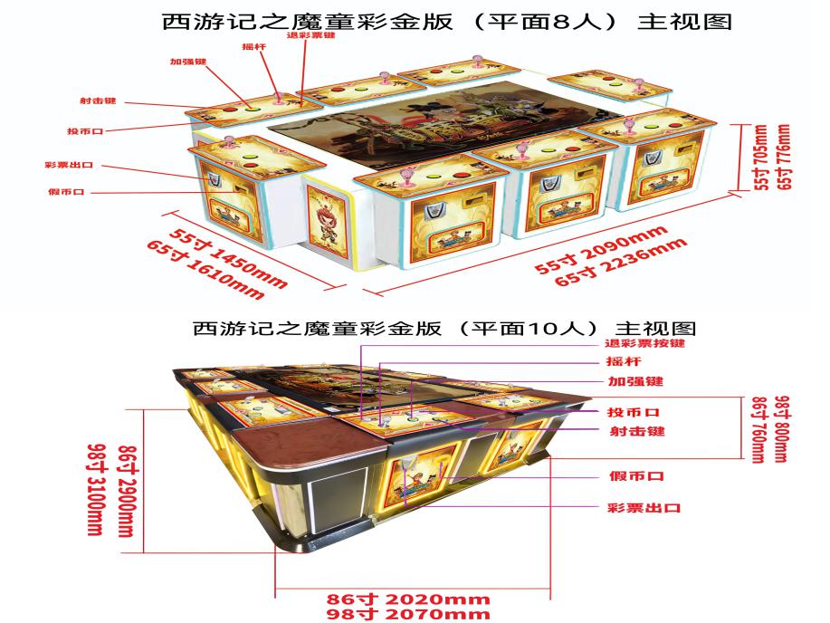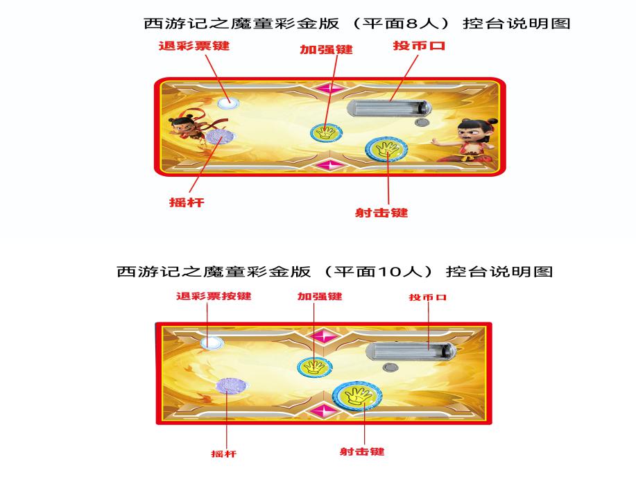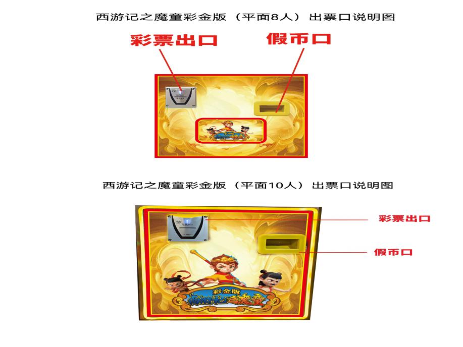 游戏内容简介 | 《西游记之魔童彩金版(平面)》是为大众娱乐而设计的一款游戏游艺彩票机,本机支持合法合规的管理系统,也可通过打开微信或支付宝扫一扫管理系统卡头二维码/屏幕二维码/实体二维码扫码支付投币或投入实体游戏代币获得对应的电子积分子弹数后玩家即可手动启动游戏。本机适用于网咖、竞技馆、动漫城、商超、台球俱乐部等符合经营许可的使用场所。本游戏可选以海洋生物+异兽+道具为游戏题材,可选鸟类生物+异兽+道具为游戏题材,可选战机+异兽+道具为游戏题材。(比如鱼类题材:虾虎鱼、暹罗斗鱼、鳉鱼、气泡鱼、狮子鱼、斑斓鱼、刺豚鱼、蓝吊鱼、灯笼鱼、乌龟、吊尾鱼、蝴蝶鱼、马尾鱼、先锋鱼、魔鬼鱼、银鲨、金鲨、莲花集满送彩金、胖头鲨、沙悟净可变身、小哪吒同生共死、螃蟹连环炮、螃蟹钻头炮、螃蟹激光炮、JP大奖、双龙刀火箭一击必杀、天降财神随机彩金一到五个位、、西游记宝典送砸金蛋、西游记宝典送九尾捕鱼、西游记宝典送渔翁捕鱼、游记宝典送龙卷风、西游记宝典送饷鼓开心30秒、西游记宝典送金船出海、西游记宝典送色盅、西游记宝典送小哪吒全屏炸弹、超级孙悟空觉醒、人形金雕怪、火麒麟送彩金、五指山定屏炸弹、如来局部炸弹、深海铠甲鳄鱼、牛魔王、猪八戒全屏炸弹、姜子牙全屏炸弹、闪电连锁、各类型鱼类组合等等。战机题材:各类型不同种类的战机、火箭全屏炸弹、二次元美女转盘送大奖、幸运宝箱、飞碟局部炸弹、屠龙刀一击必杀、开心拍拍乐30秒、飞机电磁炮、飞机钻头炮、红鱼组合、各类型战机组合等等。鸟类题材:燕子、蜂鸟、黄鹂鸟、粉色鸟、蓝鹊、猫头鹰、猛禽隼、大头鸟、老鹰、鹈鹕、鹦鹉、六尾鸡、金孔雀、绿孔雀、白头海雕、火凤凰、小猴子集满五个送彩金、鸵鸟、金鹰、蓝孔雀、金凤凰、多彩凤凰送彩金、火凤凰、仙鹤、黑龙、神雕全屏炸弹、豹子全屏炸弹、飞天神马、金象送福彩金、小财神、开心拍拍乐30秒、能量炮、天降财神随机彩金一到五个位、随机送JP大奖、金色摇钱树、超级大奖转盘、海藻、螃蟹连环炸弹、螃蟹电磁炮、螃蟹钻头炮、宝鼎送二次元美女转盘、宝鼎送幸运色盅、宝鼎送幸运宝箱、宝鼎送无敌炸弹、各类型鸟类组合等等)。由多种不同风格的场景,众多各具特色的海洋生物/战机/鸟类生物/异兽/道具身上蕴藏着无尽的秘密,等待着勇敢的玩家深入探索,体验一场视觉盛宴。在射击过程中击杀猪八戒全屏炸弹、姜子牙全屏炸弹可以获得超级大奖,让玩家获得丰厚的电子积分/彩票奖励。同时在游戏中,玩家在射击任意海洋生物/战机/鸟类生物/异兽/道具时,会消耗电子积分子弹数,击杀任何的海洋生物/战机/鸟类生物/异兽/道具都会得到该海洋生物/战机/鸟类生物/异兽/道具相对应的电子积分/彩票奖励,当玩家电子积分子弹数为零时则游戏结束。玩家可用获得的积分奖励手动选择退实物彩票/电子彩票,到店面吧台用实物彩票/电子彩票兑换精美礼品。玩家也可以选择退电子彩票直接返还到玩家手机上,也可以用手机扫卡头/屏幕二维码领取电子彩票,都可以链接到电子商城上选择心仪的礼品使用电子彩票兑换。同时为了“顺应“互联网+”发展趋势,鼓励娱乐场所与互联网结合发展,实现场内场外、线上线下互动,增强娱乐场所体验式服务”的要求,本设备可以通过物联网技术把实体游戏游艺设备的游戏内容推送到移动端供客人游玩,仅限于从实体设备所在的公众号、小程序、APP及网络推广平台入口进入的玩家游玩。 | ||