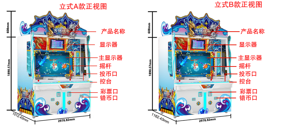 游戏内容简介 | 【龙腾盛世(推币立式)】是为大众娱乐而设计的一款以推推乐为主题的推币类游戏游艺娱乐设备,全新设计概念,射击与推币游戏完美结合。射击游戏得分后,只需要按下功能键,即可将本机的内循环币进行推推乐游戏。得分后内循环币也可以自动进入推币游戏。设备只退彩票不退币,掉落的游戏代币只在机器内部循环,不会掉落在机器外部。支持合法合规的管理系统,也可通过打开扫一扫管理系统二维码/屏幕二维码/实体二维码扫码支付投币或投入实体游戏代币获得对应的子弹数后玩家即可手动启动游戏。本机适用于网咖、竞技馆、动漫城、商超、台球俱乐部等符合经营许可的使用场所。该设备是一款集海洋鱼类,天空飞鸟,卡通昆虫,卡通怪兽,游戏人物五大主题的模拟射击类游戏。玩家在游戏中作为猎人的角色,可射击到多种海洋鱼类,包括大迦鳅鱼、小丑鱼、河豚、狮子鱼、乌龟、旗鱼、灯笼鱼、锯齿鲨、组队鱼群,霸王龟,金色龙龟,深海鳄鱼等,鱼儿游过深海、圳瑚、海底的各种奇幻世界。除了让你感受绚丽多彩,缤纷有趣的海底世界外,还能享受到捕获鱼儿的惊喜。本游戏画面逼真、新奇,游戏操作简单、直观。玩家通过遥杆及按键操控发射炮弹,收获射击鱼儿的趣味,打中目标获得相应的奖励,最终按照玩家捕获数量获得彩票。游戏设备超高清晰液晶显示屏,无论是画面精致细腻程度,或者是颜色的协调,还是光影投射的效果,都逼真的近乎完美,加上美妙的音乐,令玩家爱不释手,欢乐无穷。在游戏的过程中,效果绚丽震撼,提供给玩家一个趣味十足的游乐世界,适合成人及亲子娱乐。当以森林天空猎鸟为主题时,玩家犹如进入了鸟的天堂,沉浸在鸟语花香,与五彩缤纷的世界相融,同类鸟,闪电鸟,充满趣味和益智性适合各个年龄段的玩家,在整个冲关过程中锻炼了玩家的手眼协调性和提高玩家注意力。当以卡通昆虫类爬行为主题时,里面包含了三幅场景,分别以枝繁叶茂的夏天,果实累累的秋天以及大雪纷飞的冬天三个场景,并以与三个季节相契合的绿色、黄色、蓝色为主色调的场景打造构成。同时每个场景里面以“可爱卡通”的风格体现了每个季节的虫类动物,以毛毛虫,蜘蛛,螳螂,蝎子,蜜蜂,蚂蚁,蜻蜓等小动物的游玩,突显动态有趣的效果。可通过拍打按键以及配合晃动摇杆的方式进行捕捉,以此来获取对应的彩票数量。游戏里面还有核心boss:蜈蚣 、蜘蛛、蝎子等拥有神奇的能力,击中后将会出现奖励翻倍的效果。游戏不仅充满了趣味性,而且可以锻炼玩家的反应能力和操作能力,每一关卡都会给玩家带来了不一样的体验。当以怪兽为主题时,游戏的地图丰富,游戏开始后多种兽王随机出现,游戏玩家火力集中击杀各种兽王以及boss后可获得相应的能量值,获得的能量可以继续攻击更多魔怪以及boss,游戏玩法生动有趣,在游戏中让玩家挑战自我极限,游戏中出现的妖怪以及boss.万倍轮盘,雷凤凰,火凤凰,雷神,巨型蛛,铁甲战士,天使蛋,地狱三头犬钻头磨,炸弹,闪电虎,狼骑斗士,冰原狼人,旋风怪,巨石人,连环炸弹,魔王随从等。玩家使用子弹,自由选择攻击当前屏幕上出现的妖怪以及boss,游戏过程中不定期的出现妖风清扫,来助力玩家消灭妖怪,击倒兽王,赠送威力强大的神奇武器,玩家既获得体验感,又能提高免疫力,又能获得通关的乐趣,玩家可以使用多种不同的子弹体验多种不同的设计效果。当以游戏人物为主题时,行云流水的战斗系统: 融合了兵器切换、武技连招与元素附魔,每一场战斗都如舞蹈般华丽且充满策略。精准闪避触发“时缓”,完美格挡震碎敌人架势,给予致命一击! 自由搭配上百种技能符文,锻造和强化传奇武器装备,应对各种强大的敌人。令人震撼的Boss挑战高达数十米的深渊巨兽和诡计多端的堕落神明。每个Boss都有独特的机制和多阶段形态,胜利带来的成就感无与伦比。游戏结束后,玩家可用获得的实物彩票/电子彩票,可到店面吧台用彩票/电子彩票兑换精美礼品,电子彩票直接返还到玩家手机上或玩家用手机扫系统二维码/屏幕二维码领取相应奖励,获得实物彩票按经营方合规方式选择心仪的礼品使用(礼品需符合国家法律及当地政策的规定)。同时为了“顺应“互联网+”发展趋势,鼓励娱乐场所与互联网结合发展,实现场内场外、线上线下互动,增强娱乐场所体验式服务”的要求,本设备可以通过物联网技术把实体游戏游艺设备的游戏内容推送到移动端供客人游玩,仅限于从实体设备所在的公众号、小程序、APP及网络推广平台入口进入的玩家游玩。 | ||