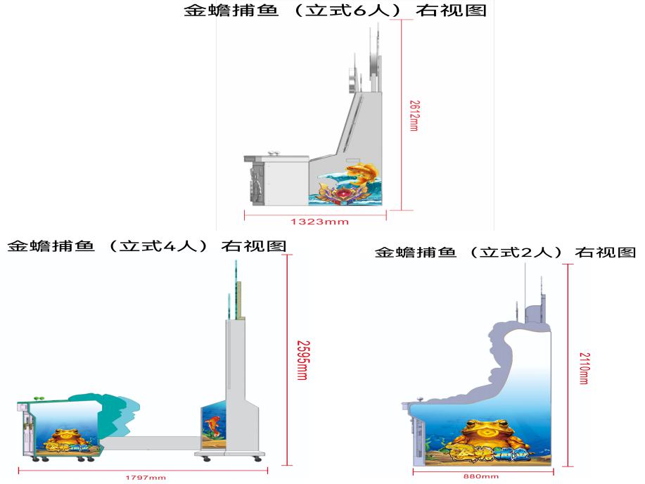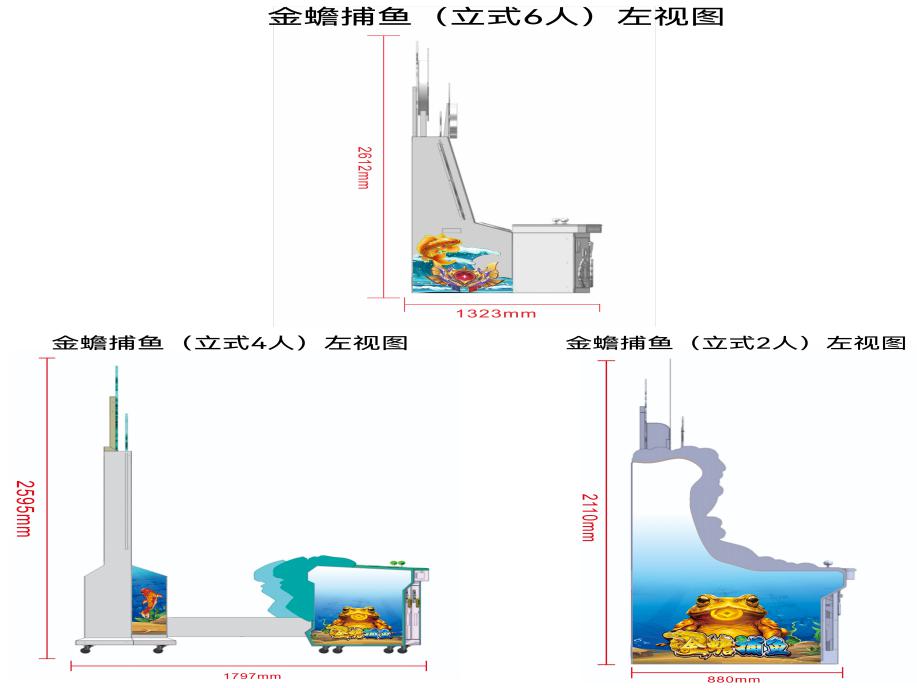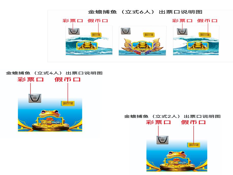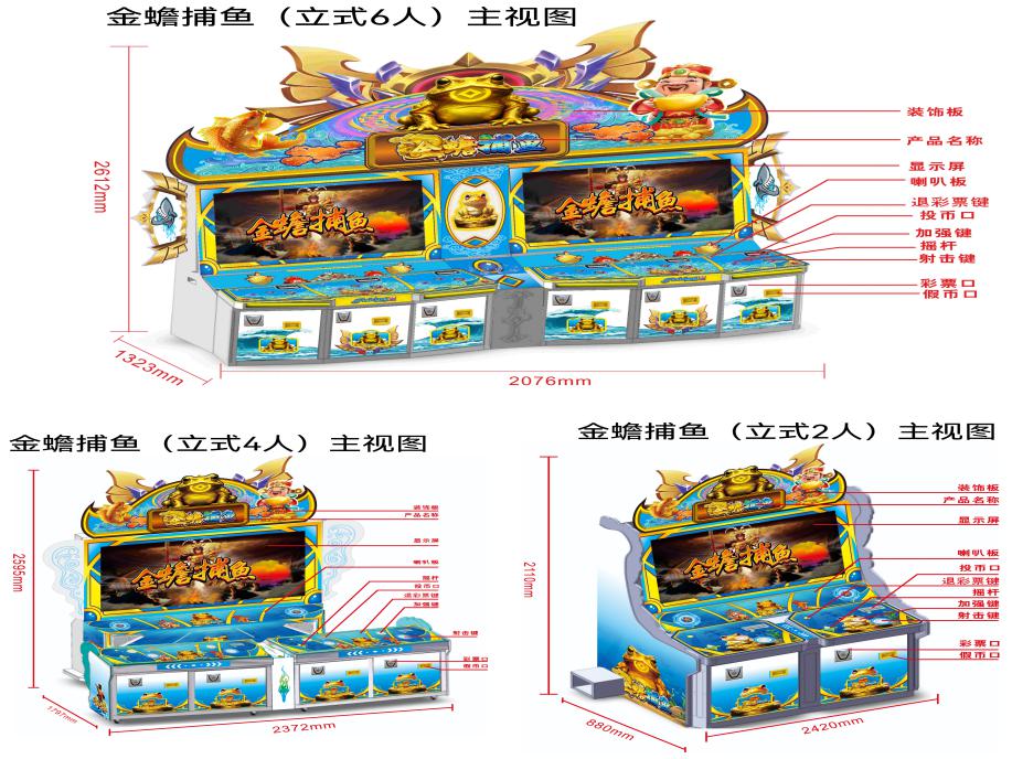 游戏内容简介 | 《金蟾捕鱼(立式)》是为大众娱乐而设计的一款游戏游艺彩票机,本机支持合法合规的管理系统,也可通过打开微信或支付宝扫一扫管理系统卡头二维码/屏幕二维码/实体二维码扫码支付投币或投入实体游戏代币获得对应的电子积分子弹数后玩家即可手动启动游戏。本机适用于网咖、竞技馆、动漫城、商超、台球俱乐部等符合经营许可的使用场所。本游戏以海洋生物+异兽+道具为游戏题材。(比如:虾虎鱼、暹罗斗鱼、鳉鱼、气泡鱼、狮子鱼、斑斓鱼、刺豚鱼、蓝吊鱼、灯笼鱼、乌龟、吊尾鱼、蝴蝶鱼、马尾鱼、先锋鱼、魔鬼鱼、银鲨、金鲨、胖头鲨、深海铠甲鳄鱼送天降财神彩金、地雷超级炸弹、金蟾、绿盘局部炸弹、金龙、小丑鱼组合、吊尾鱼组合、蓝吊鱼组合、蝴蝶鱼组合、乌龟组合、马尾鱼组合、能量炮、出奇制胜同类炸弹、开心30秒拍拍乐、屠龙刀一击必杀、金麒麟、孙悟空全屏炸弹、闹钟局部炸弹等等)。由多种不同风格的场景,众多各具特色的海洋生物/异兽/道具身上蕴藏着无尽的秘密,等待着勇敢的玩家深入探索,体验一场视觉盛宴。在射击过程中击杀深海铠甲鳄鱼、孙悟空全屏炸弹、地雷超级炸弹可以获得超级大奖,让玩家获得丰厚的电子积分/彩票奖励。同时在游戏中,玩家在射击任意海洋生物/异兽/道具时,会消耗电子积分子弹数,击杀任何的海洋生物/异兽/道具都会得到该海洋生物/异兽/道具相对应的电子积分/彩票奖励,当玩家电子积分子弹数为零时则游戏结束。玩家可用获得的积分奖励手动选择退实物彩票/电子彩票,到店面吧台用实物彩票/电子彩票兑换精美礼品。玩家也可以选择退电子彩票直接返还到玩家手机上,也可以用手机扫卡头/屏幕二维码领取电子彩票,都可以链接到电子商城上选择心仪的礼品使用电子彩票兑换。同时为了“顺应“互联网+”发展趋势,鼓励娱乐场所与互联网结合发展,实现场内场外、线上线下互动,增强娱乐场所体验式服务”的要求,本设备可以通过物联网技术把实体游戏游艺设备的游戏内容推送到移动端供客人游玩,仅限于从实体设备所在的公众号、小程序、APP及网络推广平台入口进入的玩家游玩。 | ||