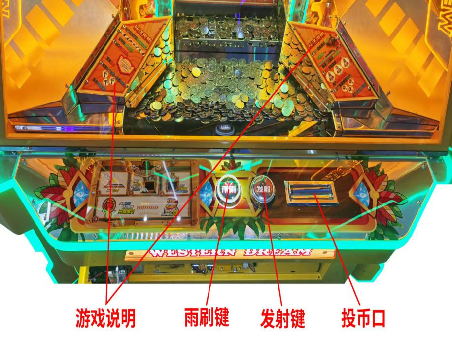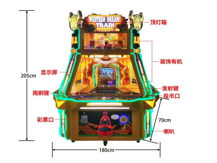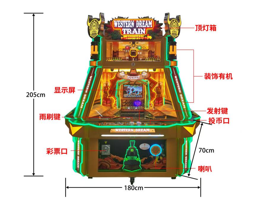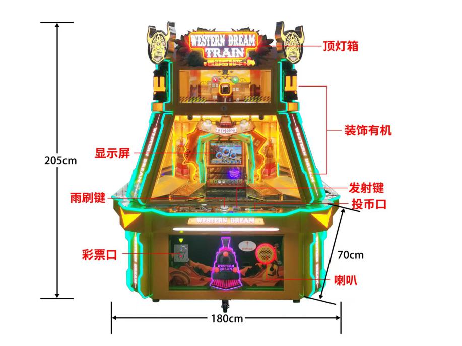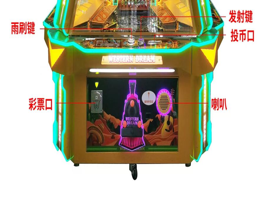 游戏内容简介 | 《西部梦列车(立式)》是一款为大众娱乐而设计的以“西部”为主题的推币类游戏游艺娱乐设备,本机支持合法合规的管理系统,投入实体游戏代币后玩家即可开始游戏。本机适用于网咖、竞技馆、动漫城、商超、台球俱乐部等符合经营许可的使用场所。设备融入了很多特色元素;如:牛仔帽、火车、啤酒桶、矿场、钱袋子、斧头、火药、手枪等。玩家投入游戏代币通过按下开始键的时间和雨刷器左右摆动的频率或控制雨刷停止,来控制游戏代币从机器最顶端掉落到堆盘的时间节点,并判断游戏代币掉落到左右移动的魔幻通道口的机会。当游戏代币落入魔幻通道,则启动图标抽奖。若三个图案一样就中奖,有8个普通通道的奖励、JP1JP2JP3ALL奖的奖励、火车奖励、火箭小游戏奖励、敲金砖小游戏奖励。奖励币从机器最顶端落到堆盘。游戏代币直接掉落到堆盘时,则堆盘推动游戏代币前进和叠加,当游戏代币滑落离开堆盘时,玩家可获得彩票奖励。游戏操作简单,机械玩法和屏幕视频游戏相结合,趣味性强,能锻炼玩家的脑力判断能力和与手操作的配合度。该游戏必定会深受玩家的喜爱。 | ||